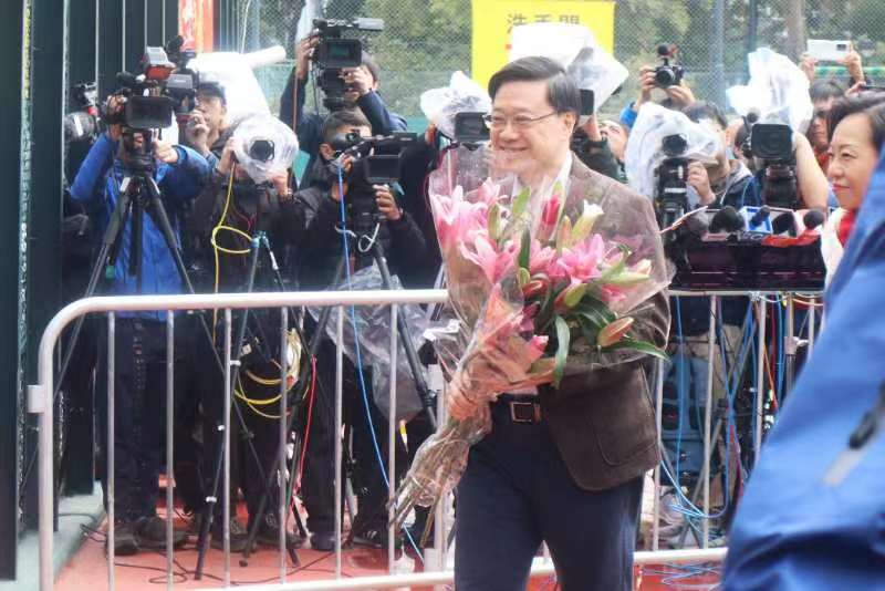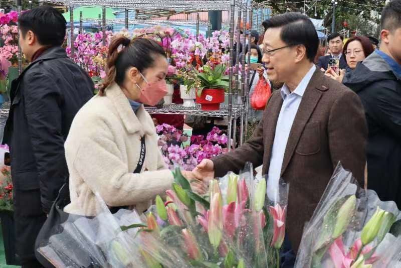 李家超表示,今天早上,我到沙田年宵市場逛花市,感受市道氣氛,並與檔主和市民交流。隨着龍年來到,政府將與社會各界同心協力,大展「龍」圖,拼經濟、謀發展,提升社會良好氣氛和市民幸福感。再次祝願年宵市場生意興「龍」,市民「龍」精虎猛、身壯力健!