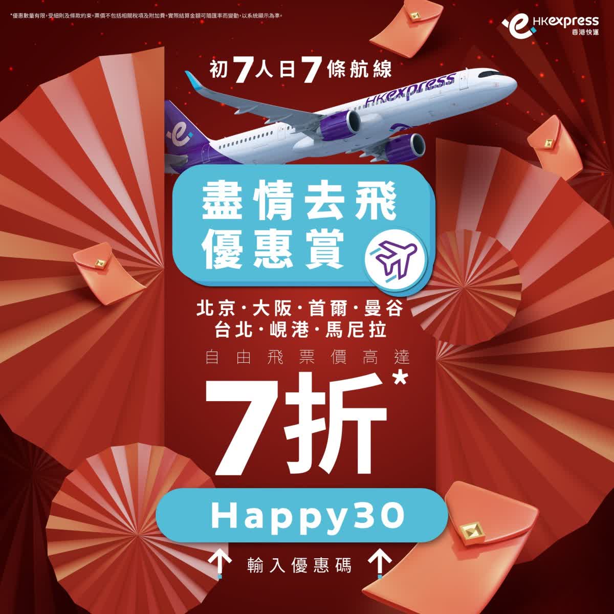 今日(16日)是年初七人日,香港快運(HK Express)推出機票優惠,在2月16日至18日,預訂北京、大阪、首爾、曼谷、峴港、台北、馬尼拉的機票(僅適用於「自由飛」票價),並輸入指定優惠碼「Happy30」,即可享高達七折優惠,最平更低至港幣48元。