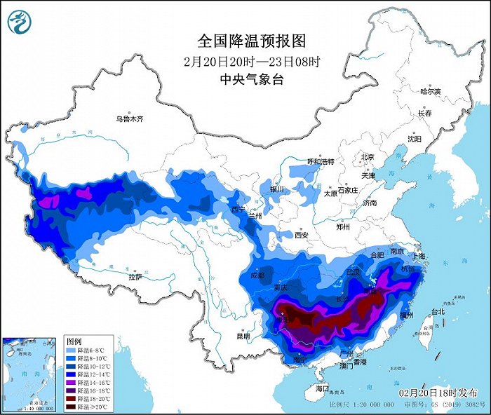 中央氣象台2月20日18時繼續發布寒潮橙色預警: