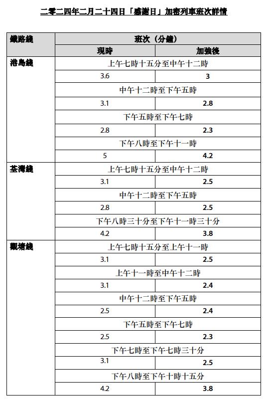 港鐵明日(24日)推出「感謝日」,以半價車費優惠答謝乘客。適逢元宵佳節,為配合因應優惠的額外乘客量,當日多條線路合共增加約370班車,以服務市民。