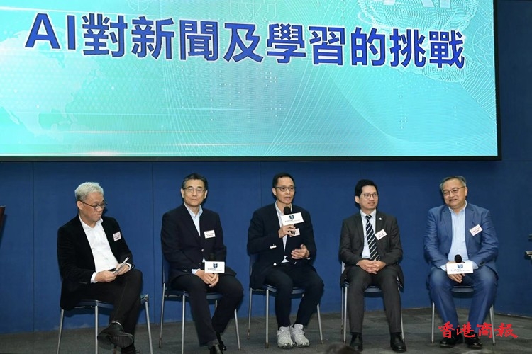 報評會執委盧偉雄(中)、香港浸會大學新聞系系主任李文(右一)、嘉諾撒聖方濟各書院校長羅勤忠(右二)、大灣區國際信息科技協會會長楊德斌(左二)與博然思維集團合夥人陳旭權(左一)進行「AI對學習和新聞的挑戰」研討會。崔俊良攝