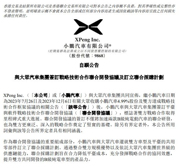 2月29日,小鵬汽車港交所公告,與大眾汽車集團簽訂戰略技術合作聯合開發協議及訂立聯合採購計劃。