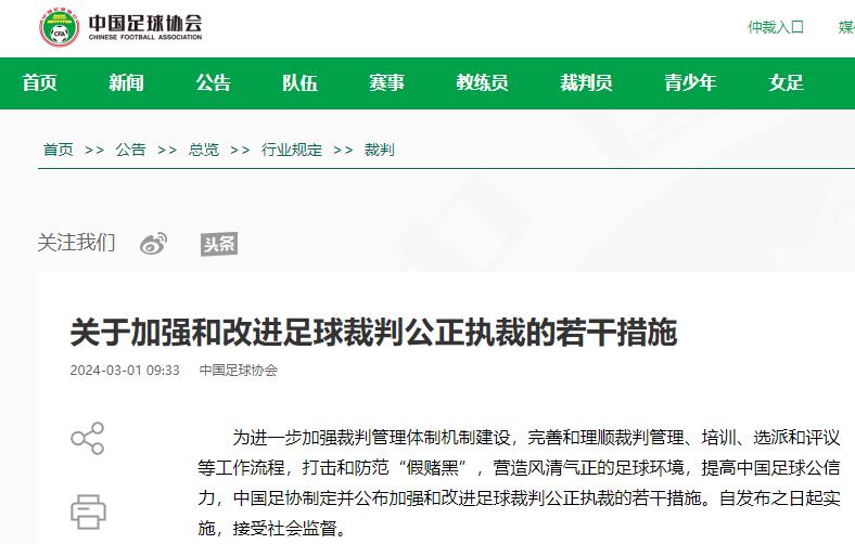 為進一步加強裁判管理體制機制建設,完善和理順裁判管理、培訓、選派和評議等工作流程,打擊和防範「假賭黑」,營造風清氣正的足球環境,提高中國足球公信力,中國足協制定並公布加強和改進足球裁判公正執裁的若干措施。自發布之日起實施,接受社會監督。