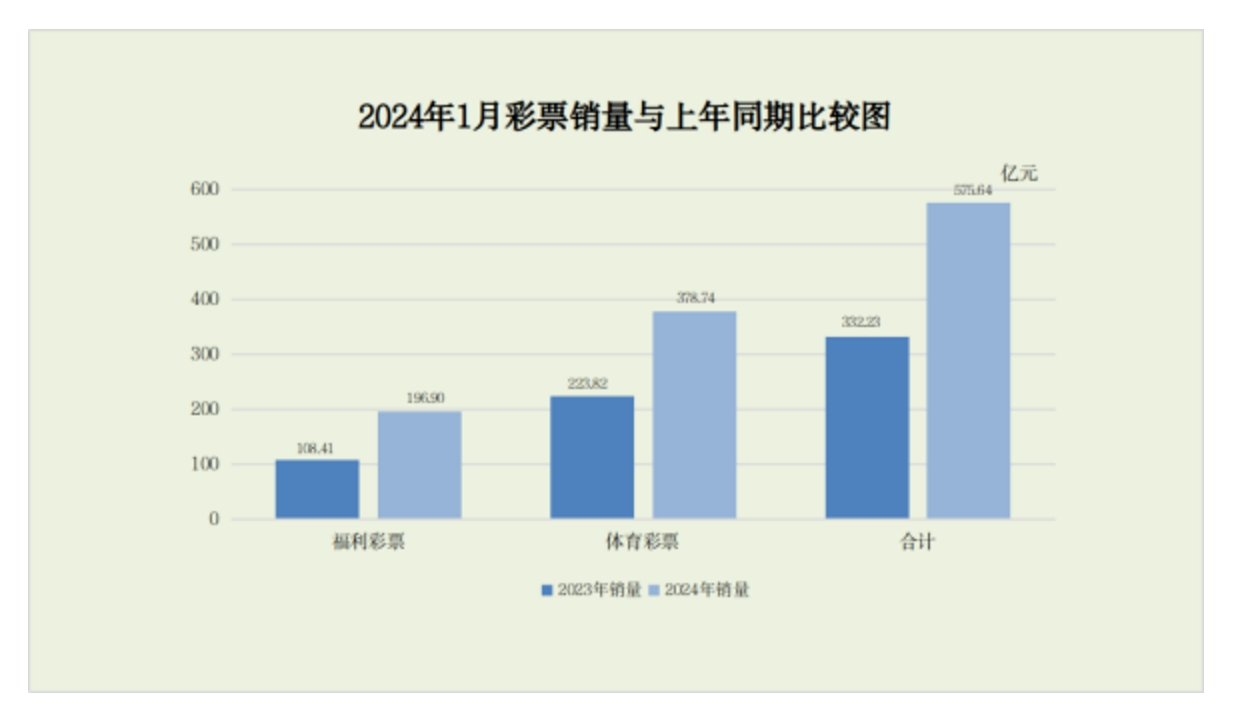 財政部1日公布2024年1月份全國彩票銷售情況。1月份,全國共銷售彩票575.64億元,同比增加243.41億元,增長73.3%。