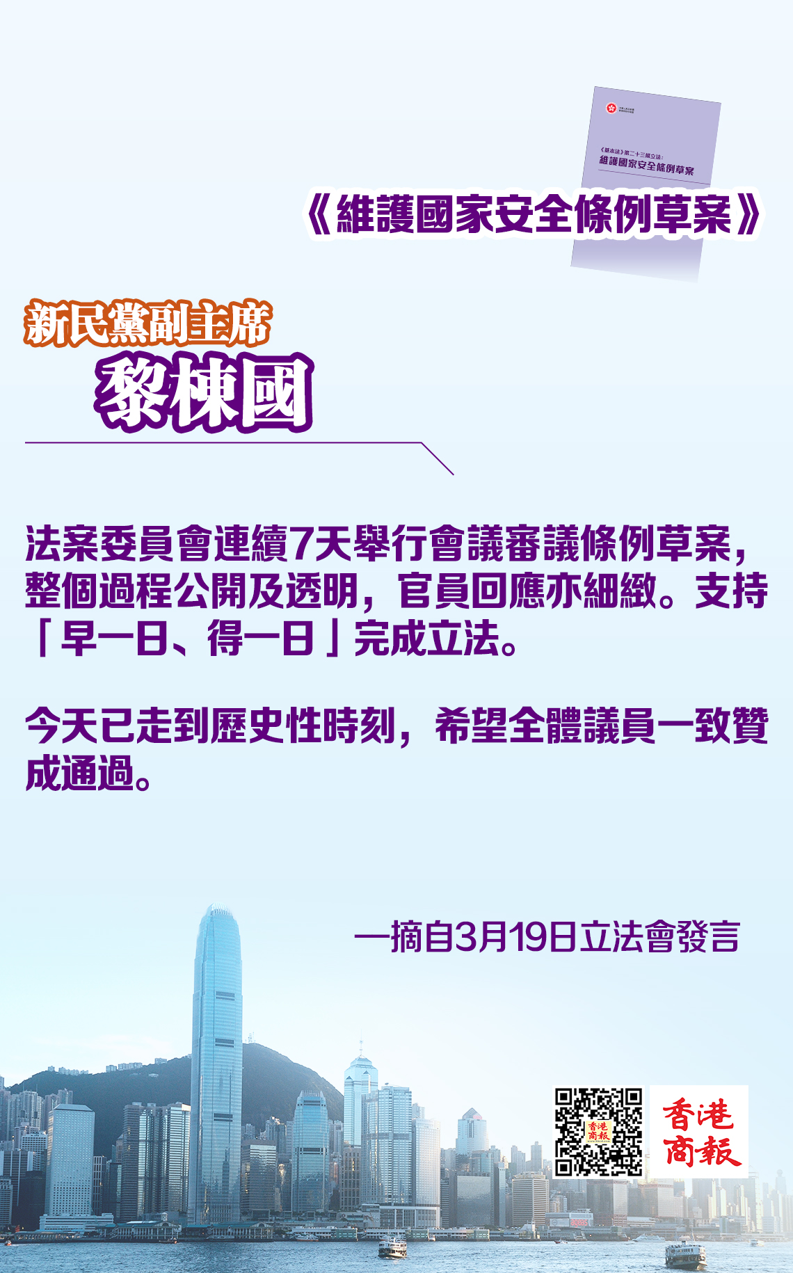 新民黨立法會議員黎棟國支持通過《維護國家安全條例草案》,表示很榮幸為香港履行維護國家安全的職責出一分力。他提到,法案委員會工作公開透明,委員們的提問及政府官員的回應都完整記錄下來,任何人都可以隨時隨地重溫今次審議。政府接納議員建議修訂條文,令條例草案更加清晰完善。他形容今日香港走到「歷史性時刻」,期待稍後三讀一致贊成通過《維護國家安全條例草案》,補足本港維護國家安全的短板。