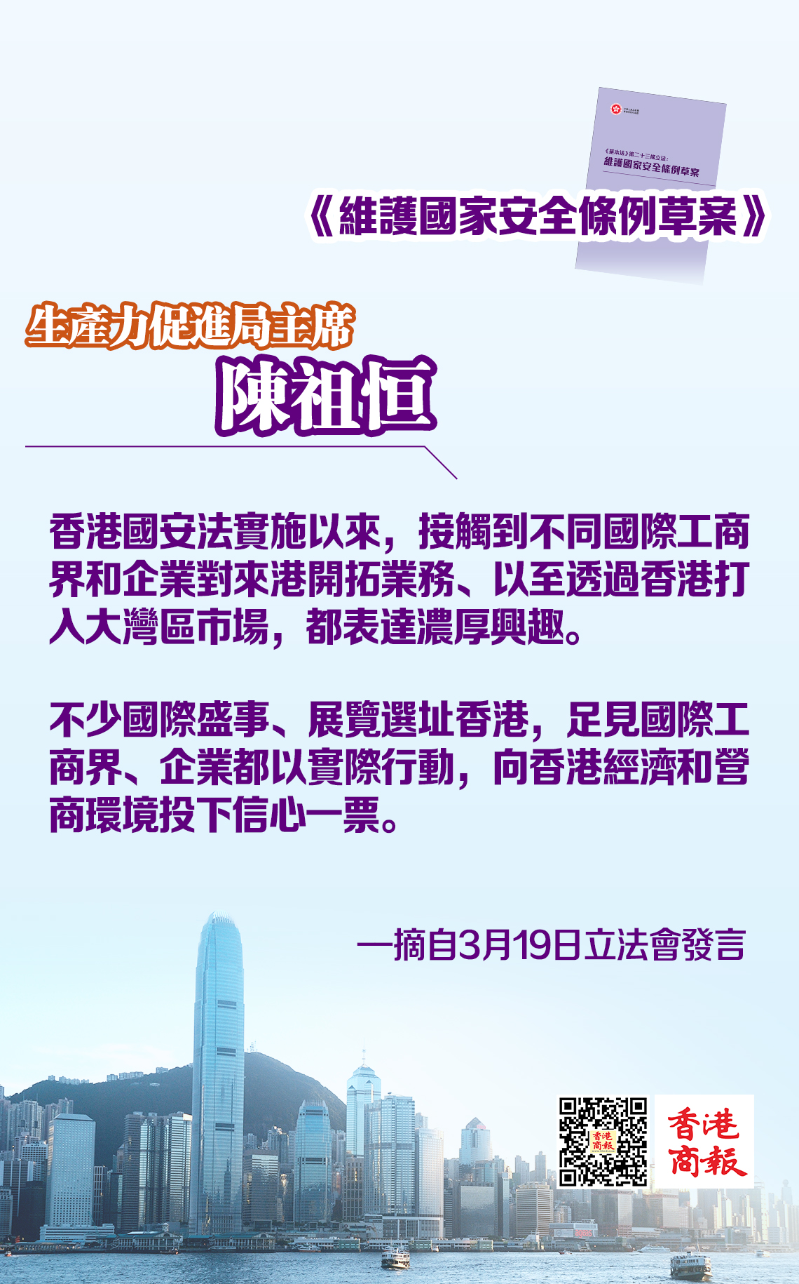 立法會議員、生產力促進局主席陳祖恒表示,好榮幸見證審議維護國家安全條例草案這一令人感動和重要的時刻。他提到,在特區政府收到超過1.3萬多份的意見中,超過98%的人表示支持23條立法。早日完成立法是民心所向,有巨大的民意基礎。針對某些外國政客肆意的污衊和攻擊,他表示支持政府迅速回擊,工業界、紡織和製衣界,將會全面配合政府維護國家安全工作。陳祖恒相信維護國安條例和香港國安法將會組成維護國家安全的組合拳,令香港的營商環境和投資環境,長遠發展更強更穩定。