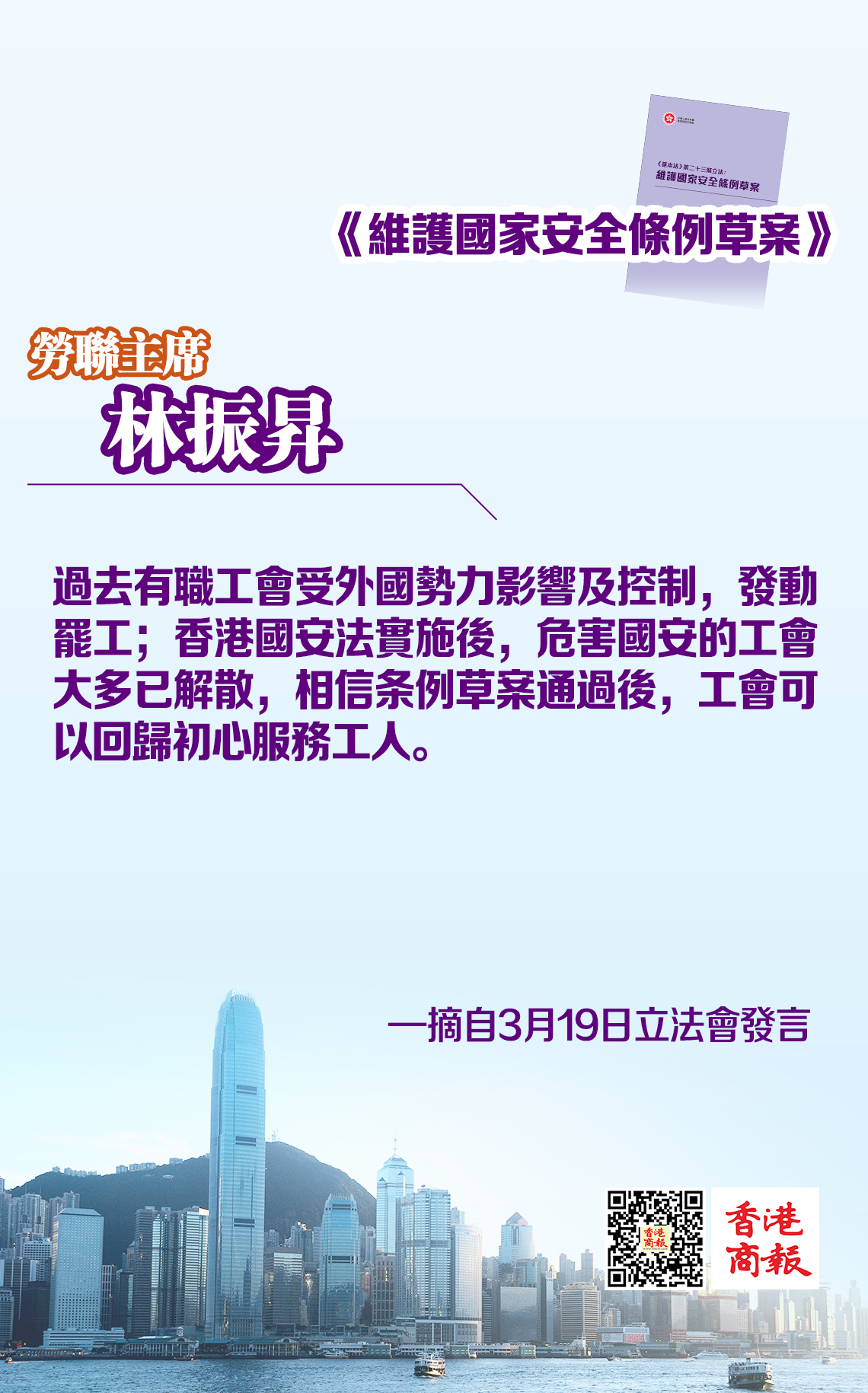 勞聯主席、立法會議員林振昇指出,過去曾有職工會受外力影響或控制,發動政治罷工,而不是集中勞工事務,但國安法實施後,這些危害的工會多已解散,相信條例草案通過後,工會可以回歸初心服務工人。他又認為如果明知有國際勞工組織危害國安,作為本地工會應該有義務和意識與對方斷絕來往、予以譴責及作出舉報。