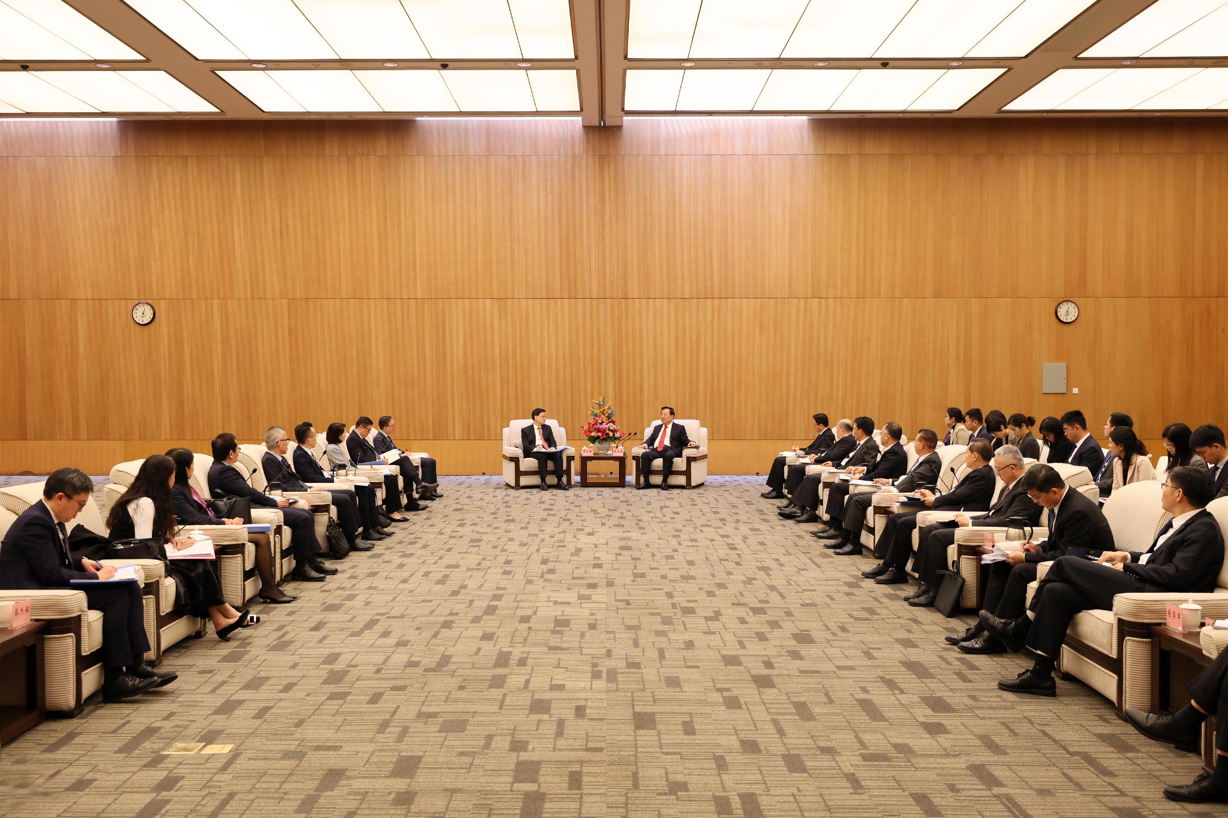 中央港澳工作辦公室主任、國務院港澳事務辦公室主任夏寶龍(右)今日上午在深圳與行政長官李家超(左)會面。