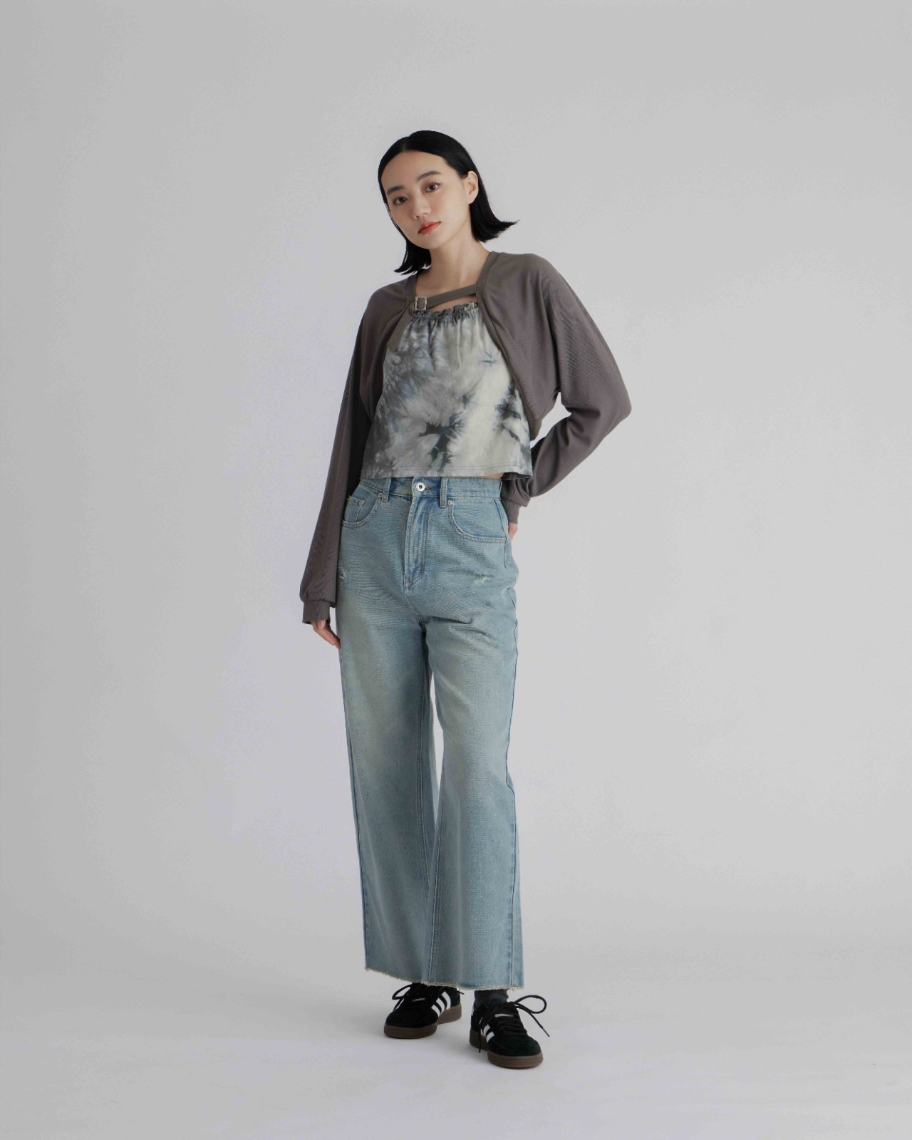 Jacquard Cardigan Twin Set(上身),有米白及淺啡選擇,HK$299。Frayed Denim Mermaid Skirt(下身),有深藍及淺藍選擇,HK$599。