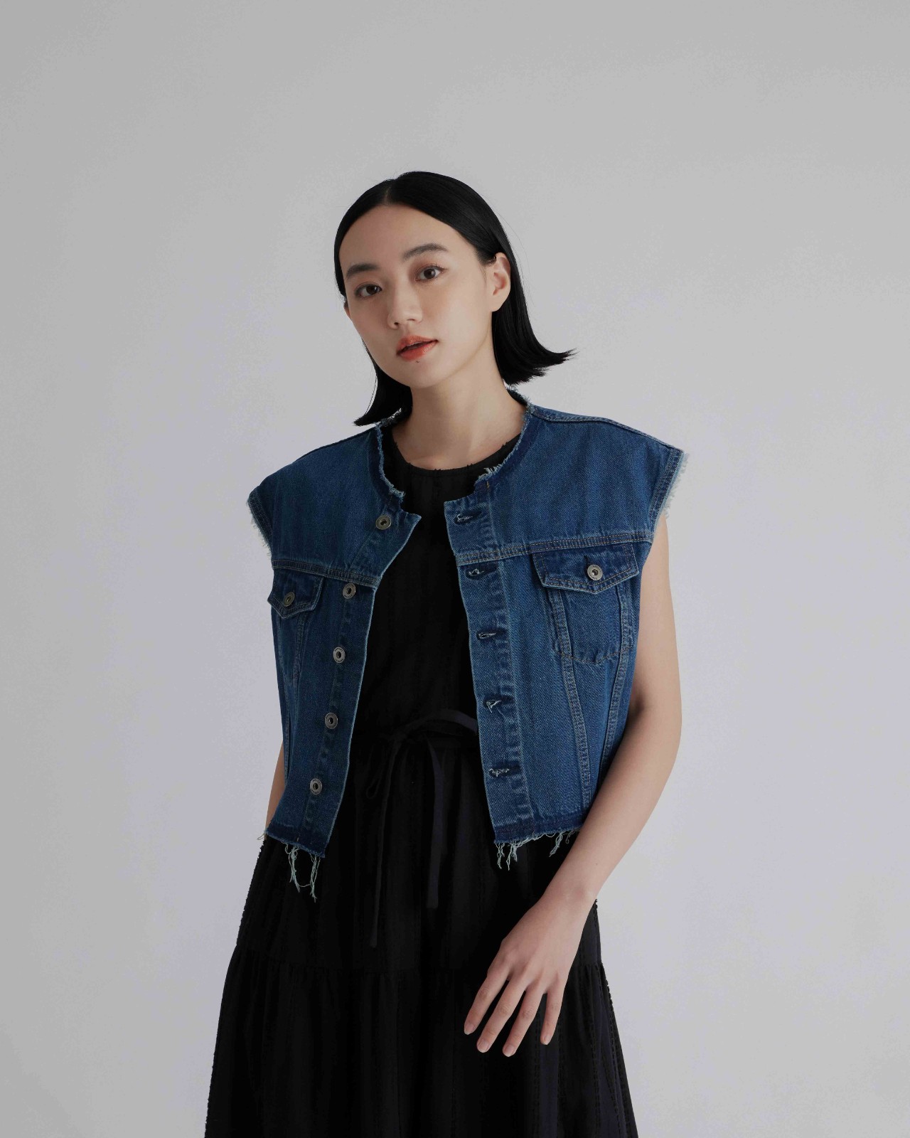 Washed Cap Sleeve Denim Vest,有深藍及石磨藍選擇,HK$599。