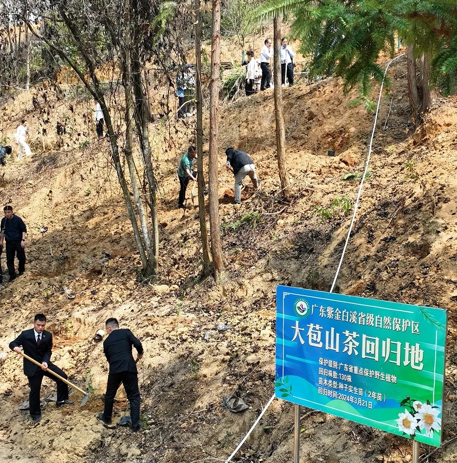 當天,廣東紫金白溪省級自然保護區管理處與紫金縣檢察院等部門共同舉辦全市首次「珍稀瀕危植物回歸季」啟動儀式暨大苞山茶野外回歸行動,讓首批人工培植的130株大苞山茶「回家」,種植在原生地——紫金白溪保護區散灘水庫片區,讓瀕危的大苞山茶在紫金棲息地自然更新與繁衍,進一步保護和擴大大苞山茶野外種群。