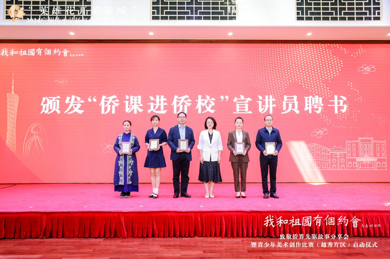 分享會現場,廣州市僑辦、越秀區委統戰部還分別為廣州市「僑課進僑校」宣講員和越秀區首批「僑說廣州」百姓宣講員頒發了聘書。宣講員們表示,將認真講好華僑「愛國、愛鄉、愛家人」的感人故事,致力於傳承僑界紅色基因,用有聲有色的宣講推動華僑精神進校園、進社區、進萬家。
