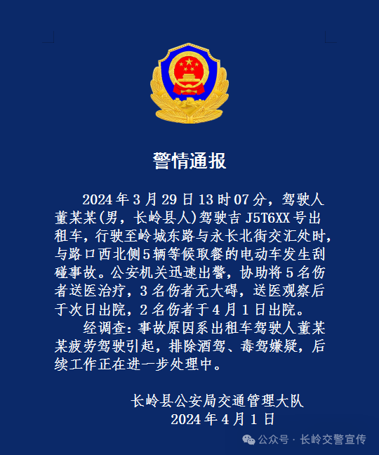 通報稱,2024年3月29日13時07分,吉林松原長嶺,駕駛人董某某駕駛吉J5T6XX號出租車,行駛至嶺城東路與永長北街交匯處時,與路口西北側5輛等候取餐的電動車發生刮碰事故。公安機關迅速出警,協助將5名傷者送醫治療,3名傷者無大礙,送醫觀察後於次日出院,2名傷者於4月1日出院。