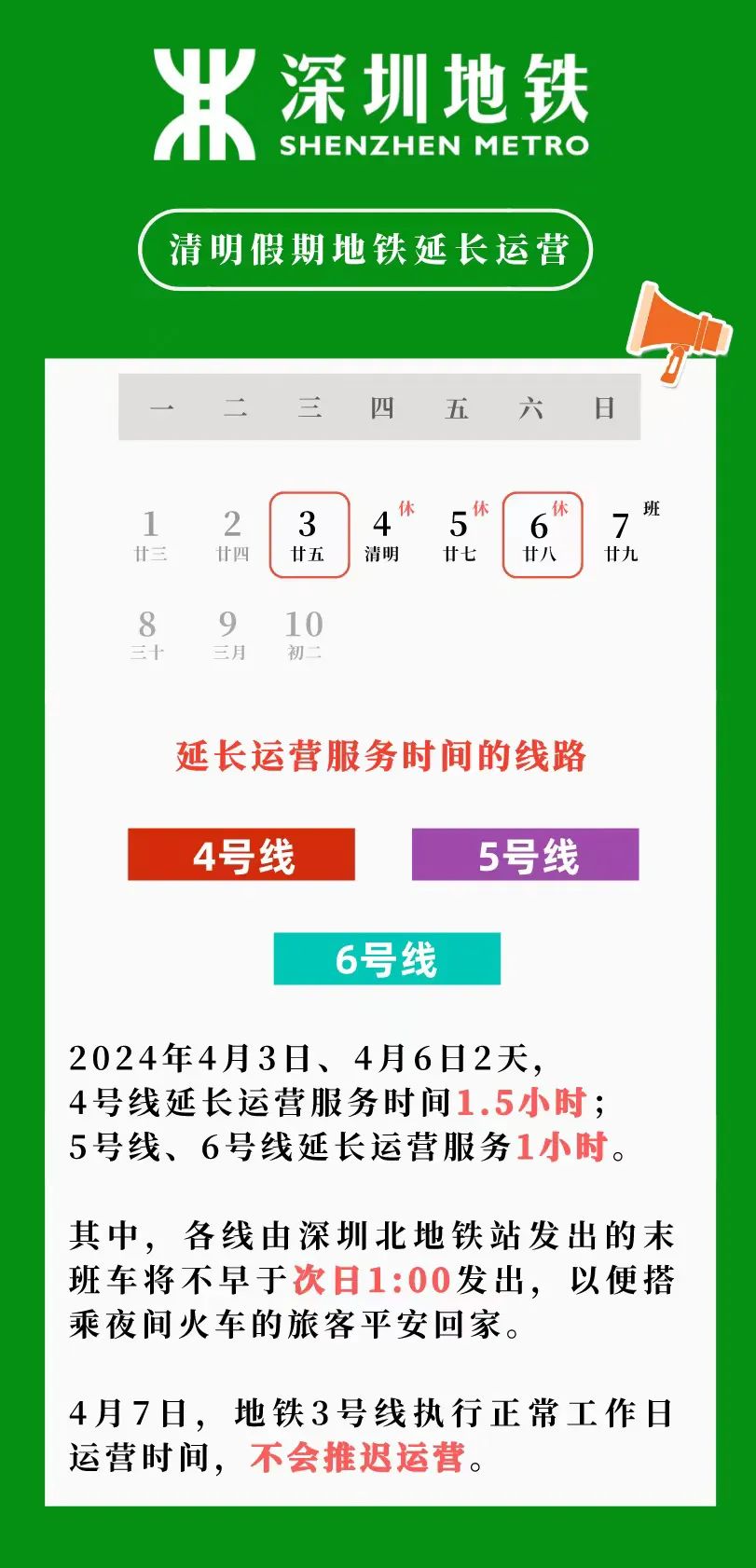 此外,4月7日(周日)地鐵3號線將執行,正常工作日運營時間,不會推遲運營。