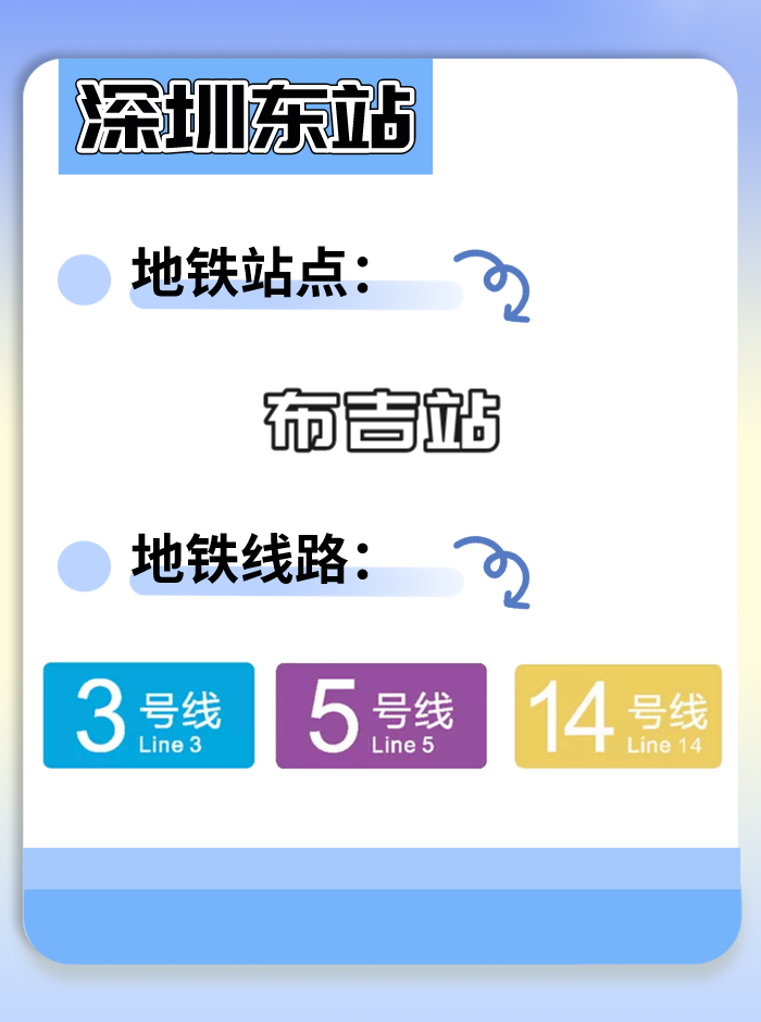 目前深圳東站火車站出站口只設置在東廣場負一層火車出站口A,乘客出站後可根據現場的導向標識搭乘3號線、5號線、14號線。