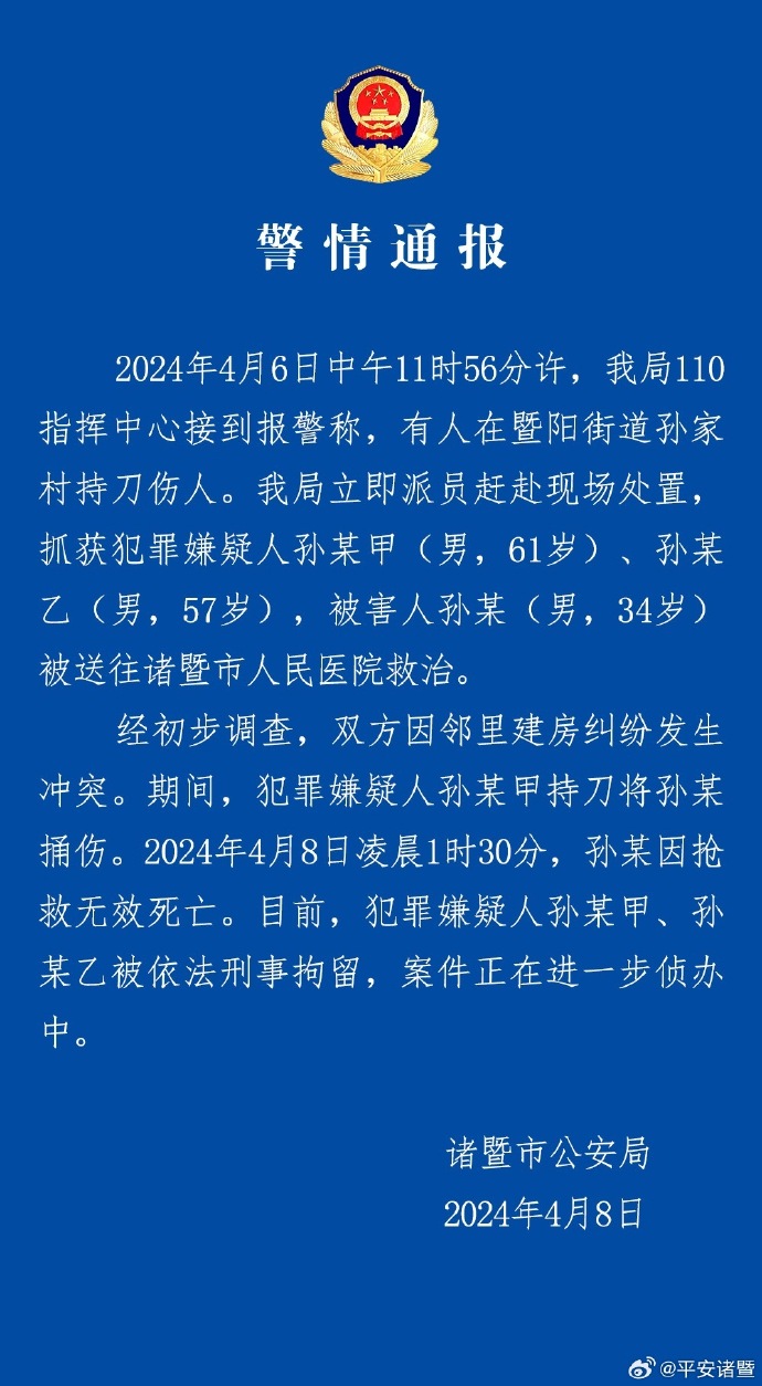 4月8日,浙江諸暨市公安局通報:4月6日中午11時56分許,我局110指揮中心接到報警稱,有人在暨陽街道孫家村持刀傷人。我局立即派員趕赴現場處置,抓獲犯罪嫌疑人孫某甲(男,61歲)、孫某乙(男,57歲),被害人孫某(男,34歲)被送往諸暨市人民醫院救治。經初步調查,雙方因鄰里建房糾紛發生衝突。期間,犯罪嫌疑人孫某甲持刀將孫某捅傷。2024年4月8日凌晨1時30分,孫某因搶救無效死亡。目前,犯罪嫌疑人孫某甲、孫某乙被依法刑事拘留,案件正在進一步偵辦中。