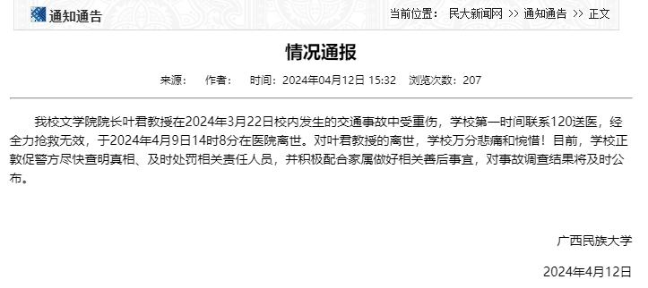 據廣西民族大學網站消息,廣西民族大學4月12日發布情況通報,該校文學院院長葉君教授在2024年3月22日校內發生的交通事故中受重傷,學校第一時間聯繫120送醫,經全力搶救無效,於2024年4月9日14時8分在醫院離世。對葉君教授的離世,學校萬分悲痛和惋惜!目前,學校正敦促警方盡快查明真相、及時處罰相關責任人員,並積極配合家屬做好相關善後事宜,對事故調查結果將及時公布。