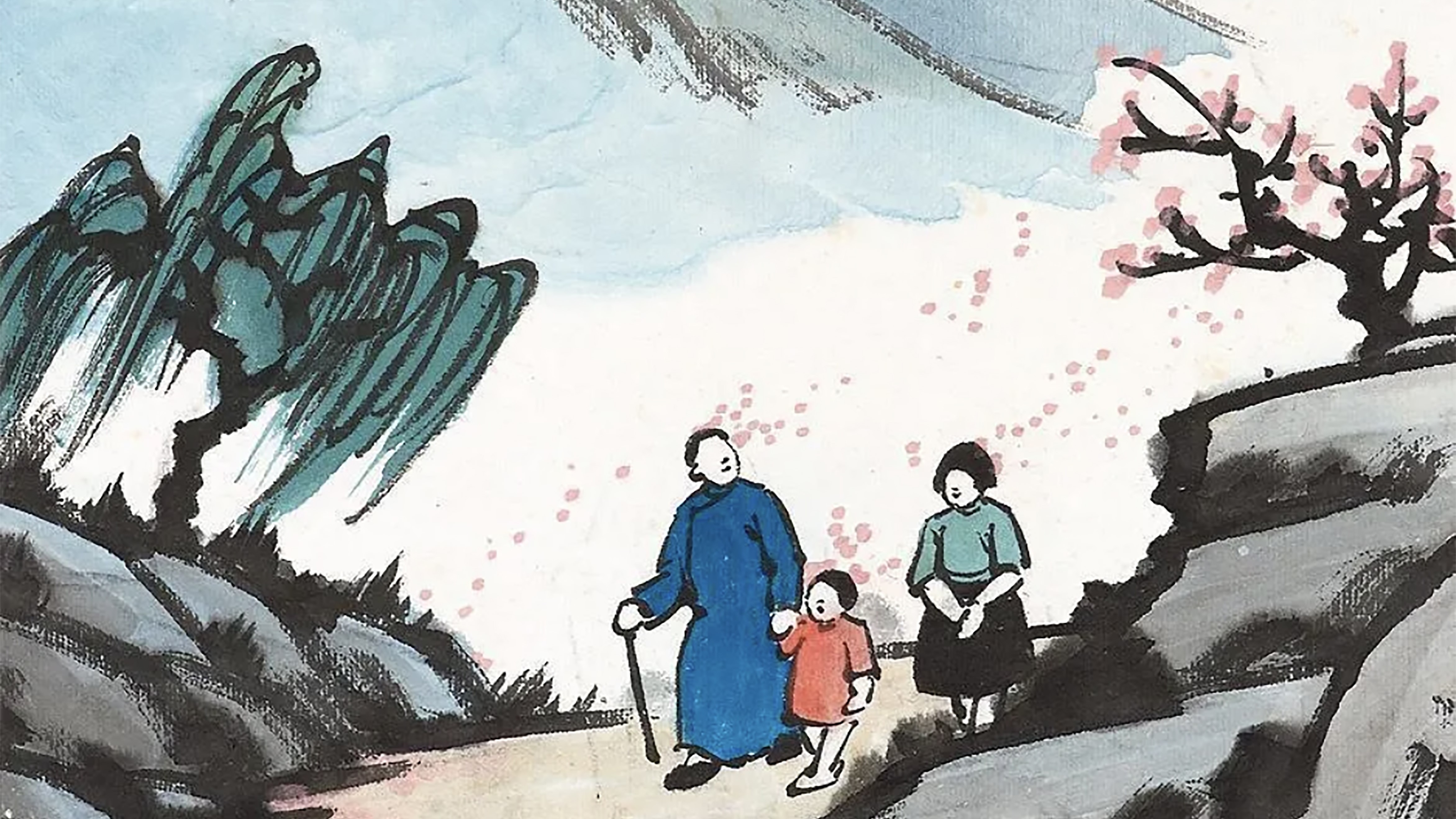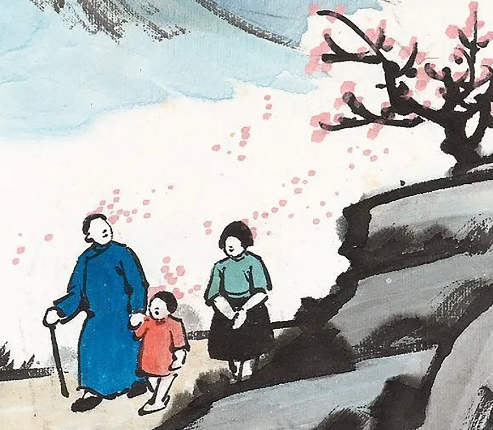 此畫以「春日遊」為題,充滿了生活的情趣。一家三口攜手走在山間小道上,正值花紅柳綠時節,春日的美好與家人之間的溫情躍然紙上。豐子愷的繪畫通常以單線平塗,用筆流暢,線條簡練。他的作品中很少繪製五官的表情,而是留白,通過人物的動作來表現心理活動,引人思索,這成為了其人物畫的一大特色。畫中的三人神情各異,父親牽着女兒,抬頭看着盛開的桃花,嘴角似乎帶着笑容;女兒望向前方,彷彿好奇地詢問眼前所見的一切;母親雙手交疊在身前,低頭看着女兒,彷彿能透過畫面感受到慈愛的目光。儘管筆墨不多,但其中的細節值得反覆品讀,令人回味。