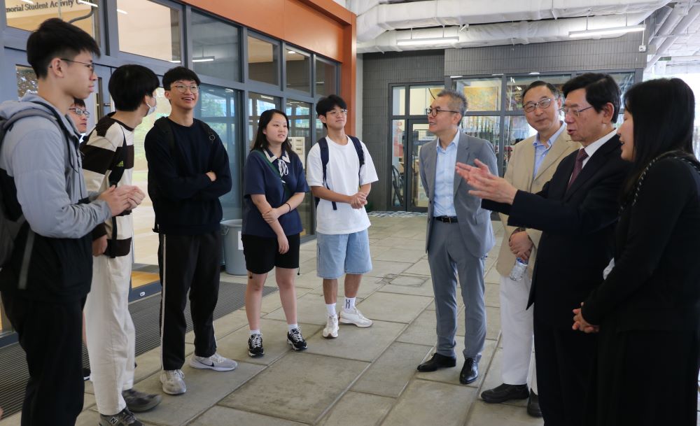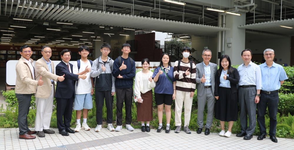 容永祺(左三)聯同魏向東(左二)與麥勁生(右四)在今早公民科考試後,向該校的幾位考生及助理校長李朝暉(左一)、公民科試場主任張老師(右三)、副校長余百欣(右二)及數學科試場主任梁老師(右一),了解第二代公開考試支援系統的運作情況。