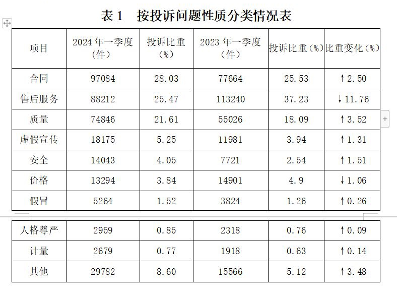 根據投訴性質,合同問題佔28.03%,售後服務問題佔25.47%,質量問題佔21.61%,其他問題佔8.60%,虛假宣傳問題佔5.25%,安全問題佔4.05%,價格問題佔3.84%,假冒問題佔1.52%,人格尊嚴問題佔0.85%,計量問題佔0.77%。