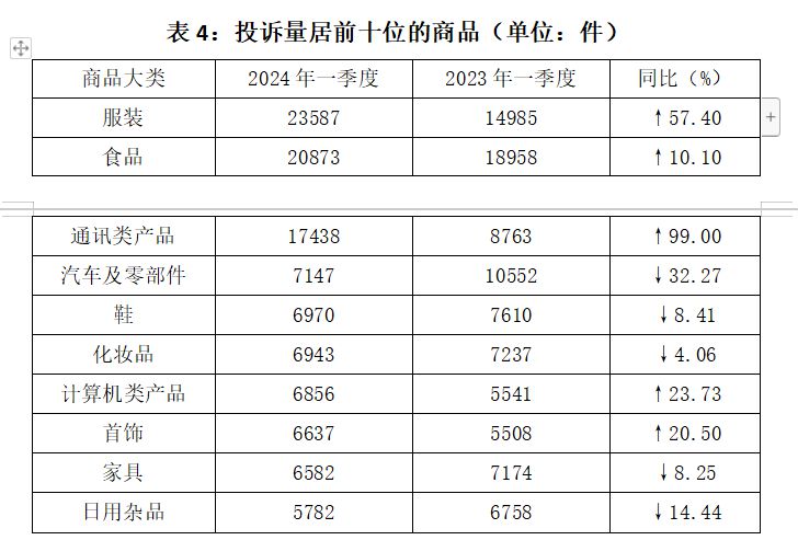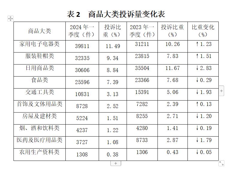 根據2024年一季度商品大類投訴數據,家用電子電器類、服裝鞋帽類、日用商品類、食品類和交通工具類投訴量居前五位。與2023年一季度相比,服裝鞋帽類、家用電子電器類投訴量比重分別上升1.51和1.23個百分點,日用商品類、交通工具類投訴量比重分別下降2.83和1.93個百分點。