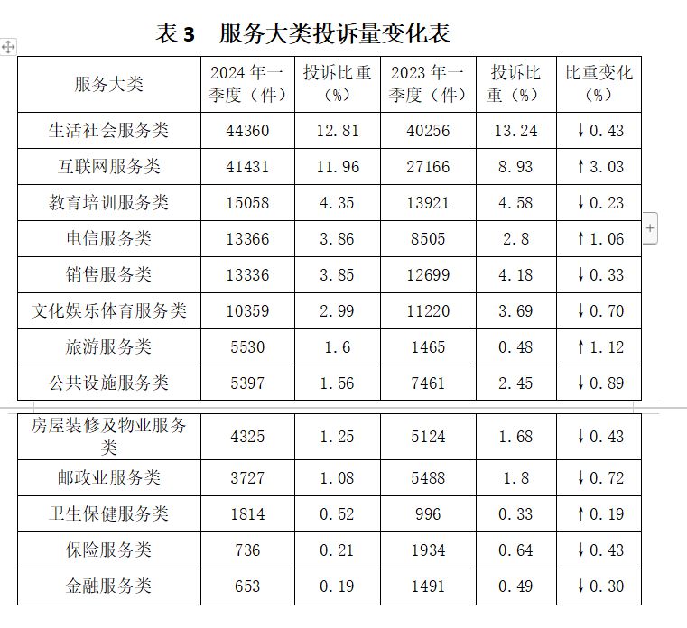 根據2024年一季度服務大類投訴數據,生活社會服務類、互聯網服務類、教育培訓服務類、電信服務類、銷售服務類居於前五位。與2023年一季度相比,互聯網服務類投訴量比重上升3.03個百分點,公共設施服務類投訴量比重下降0.89個百分點。