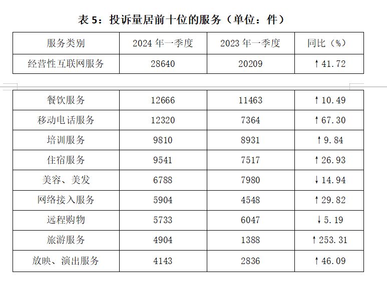 在具體服務投訴中,投訴量居前五位的分別為經營性互聯網服務、餐飲服務、流動電話服務、培訓服務、住宿服務。與2023年一季度相比,旅遊服務、網絡接入服務進入服務類投訴前十。其中旅遊服務、流動電話服務、放映演出服務增長較高,美容美髮有所下降。