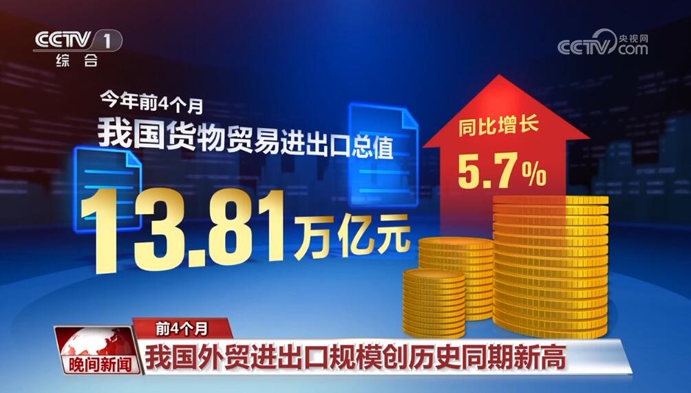 海關總署5月9日公布,前4個月,中國外貿進出口同比增長5.7%,規模創歷史同期新高。