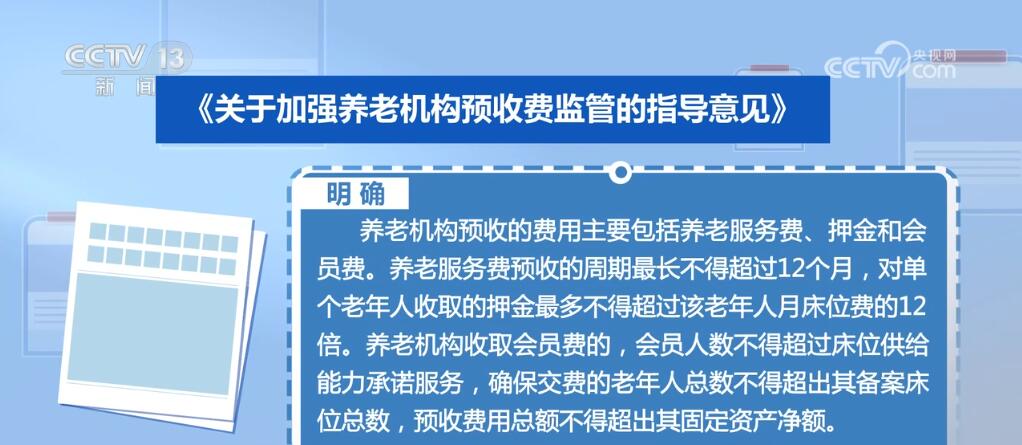 《意見》明確,養老機構預收的費用主要包括養老服務費、押金和會員費。養老服務費預收的周期最長不得超過12個月,對單個老年人收取的押金最多不得超過該老年人月床位費的12倍。養老機構收取會員費的,會員人數不得超過床位供給能力承諾服務,確保交費的老年人總數不得超出其備案床位總數,預收費用總額不得超出其固定資產淨額。