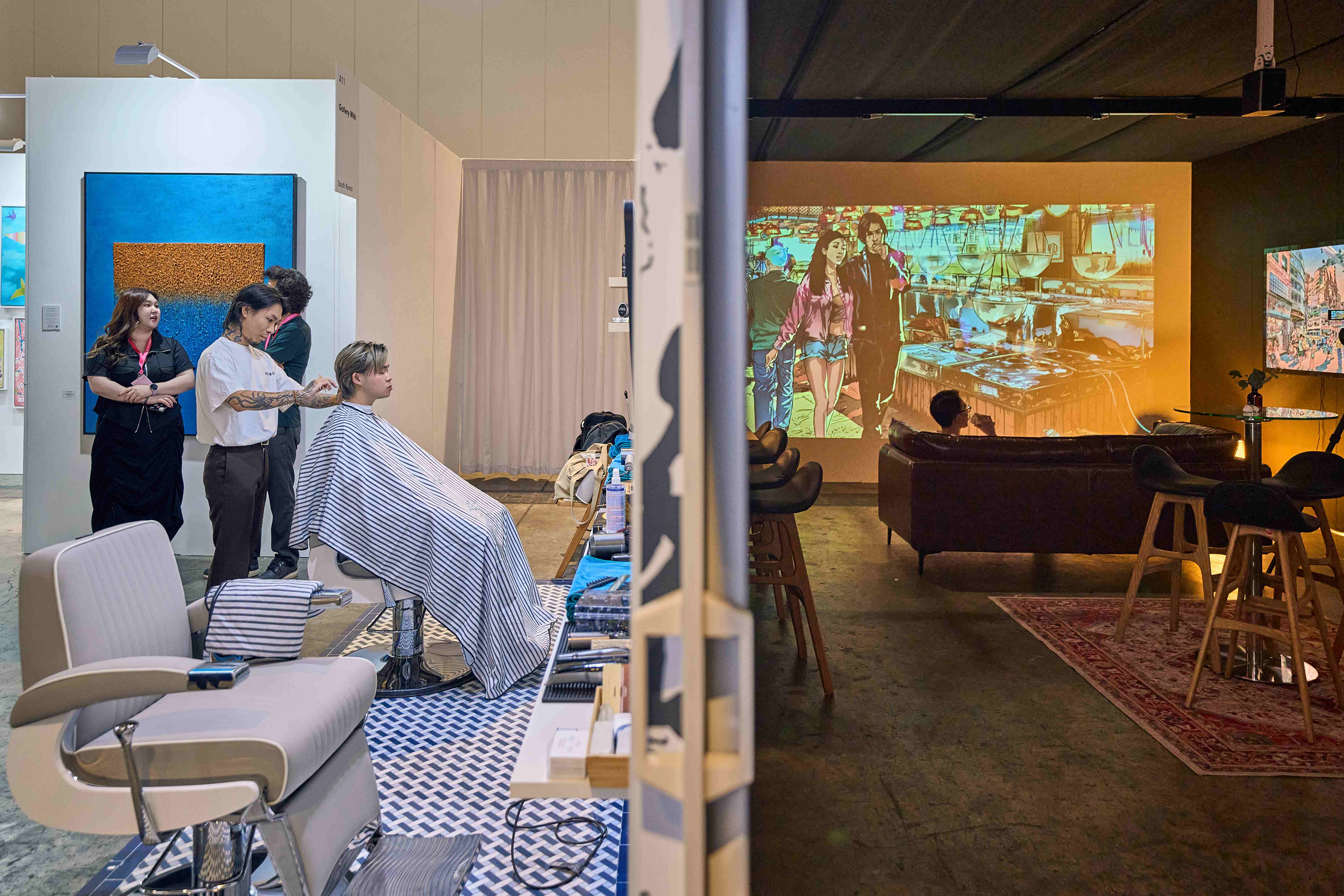 旅發局與Affordable Art Fair Hong Kong 2024聯手策展互動裝置藝術體驗 —《霓虹》秘密酒吧。秘密酒吧內有12幅以香港街景為主題的藝術插畫,酒吧外更設有上海舊式理髮廳,訪客可即席體驗懷舊理髮服務。