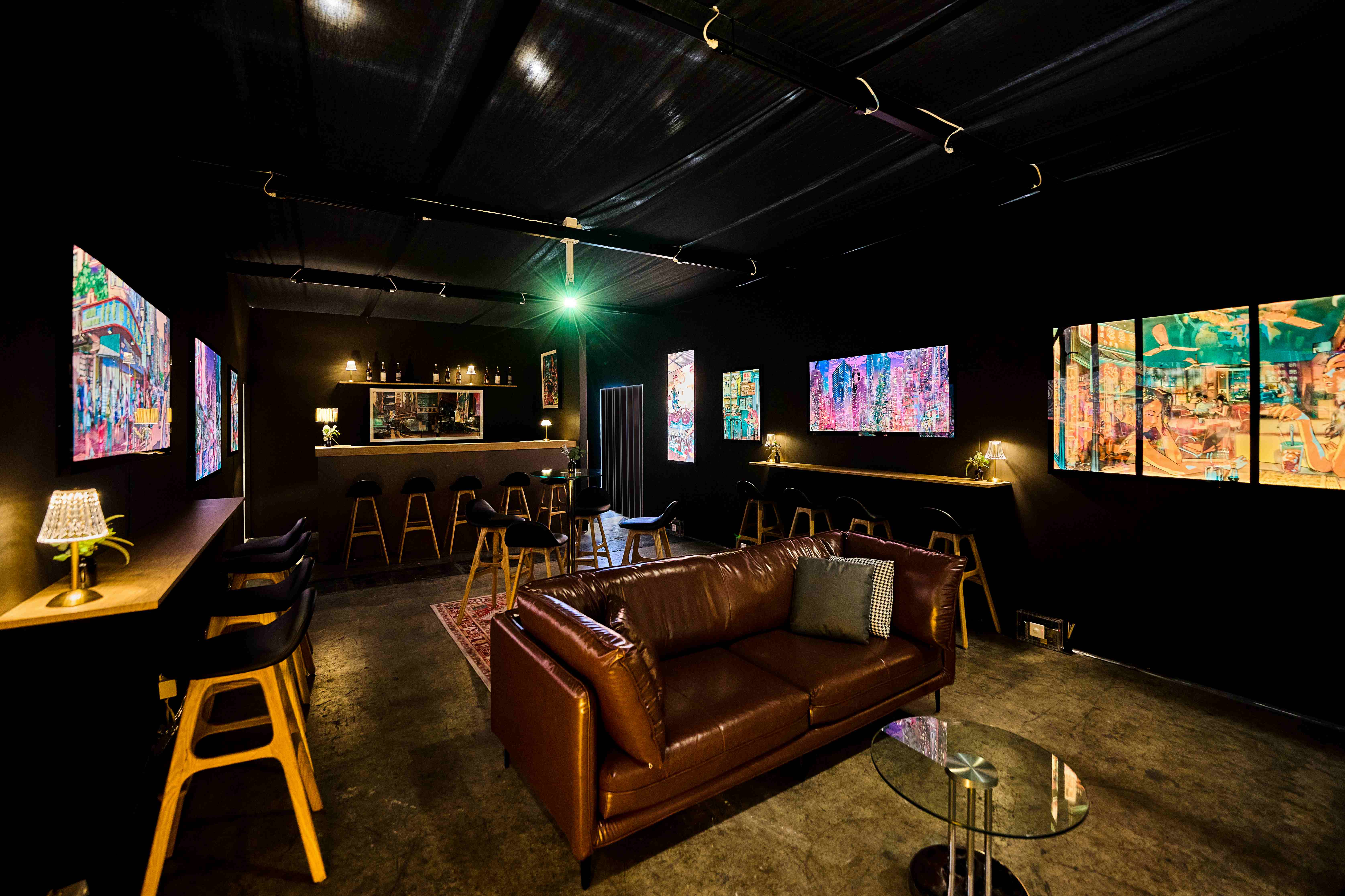 穿過店面隨即進入霓虹燈下的秘密酒吧,內設12幅由Jonathan Jay Lee創作的插畫,以高飽和色彩漫畫風格,仔細刻劃香港街景光影及市民百態。特別將本地舊區特色元素如唐樓、傳統麵檔及霓虹招牌注入插畫內,冀勾起觀眾了解香港街角情懷之興趣。