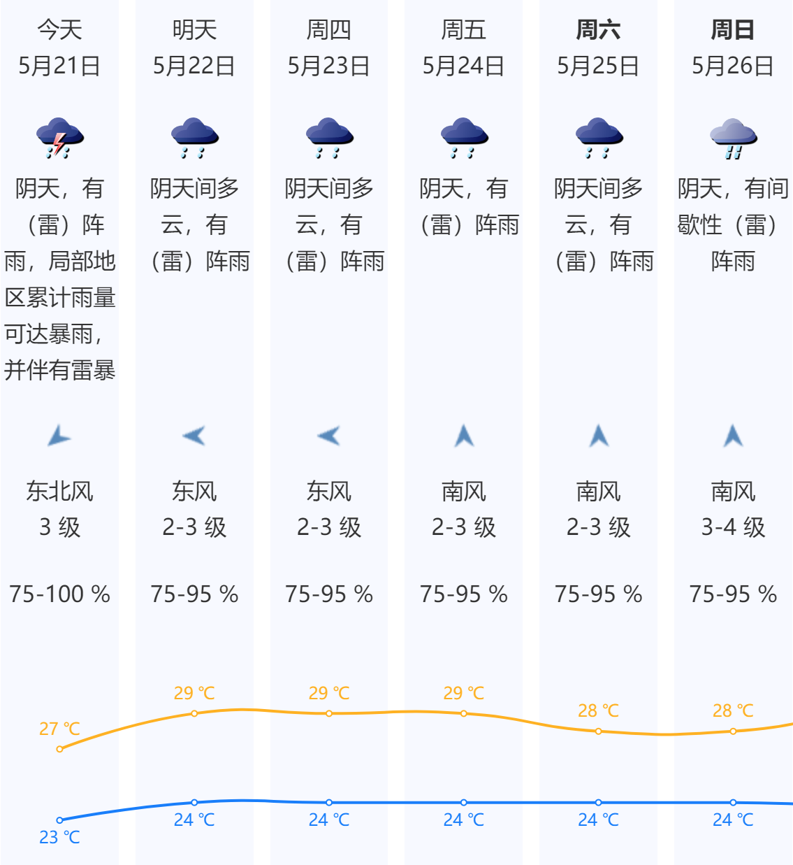 5月21日,深圳陰天,有(雷)陣雨,局部地區累計雨量可達暴雨,並伴有雷暴;氣溫23-27℃;東北風3級,沿海、高地和海區陣風7級;相對濕度75%-100%。