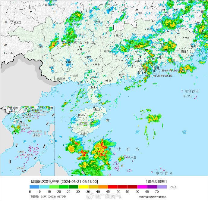 5月21日,粵東市縣陰天,有大雨到暴雨,其餘市縣多雲到陰天,有小到中雨。廣東省最高氣溫:河源、梅州和粵東市縣23℃~26℃,其餘市縣27℃~31℃。