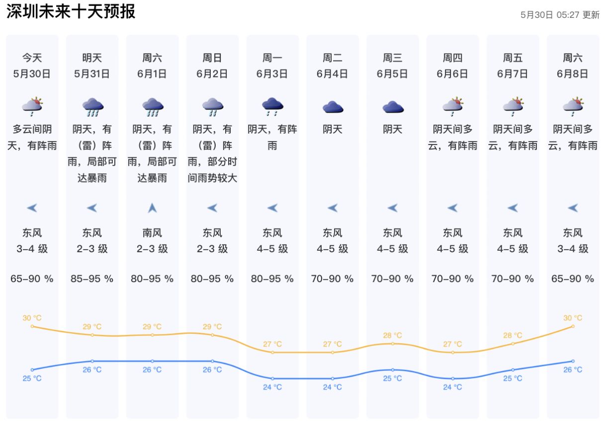 根據天氣預報,5月30日深圳將迎來多雲間陰天氣,有陣雨出沒,氣溫介於25-30℃之間,沿海高地地區還將有6-7級的陣風掃過。
