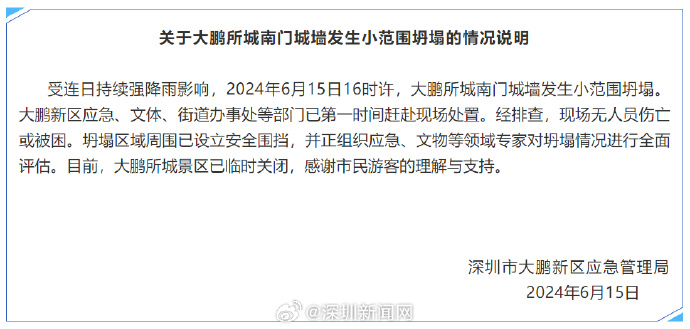 深圳大鵬新區應急管理局6月15日發布《關於大鵬所城南門城牆發生小範圍坍塌的情況說明》,聲明指,受連日持續強降雨影響,2024年6月15日16時許,大鵬所城南門城牆發生小範圍坍塌大鵬新區應急、文體、街道辦事處等部門已第一時間趕赴現場處置。經排查,現場無人員傷亡或被困。坍塌區域周圍已設立安全圍擋,並正組織應急、文物等領域專家對坍塌情況進行全面評估。目前,大鵬所城景區已臨時關閉,感謝市民遊客的理解與支持。