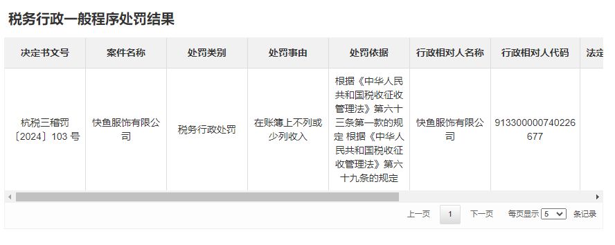 據杭州市稅務局網站近日披露,快魚服飾有限公司因在賬簿上不列或少列收入,根據《中華人民共和國稅收徵收管理法》第六十三條第一款、《中華人民共和國稅收徵收管理法》第六十九條的規定,被國家稅務總局杭州市稅務局第三稽查局罰款1889841.91元。