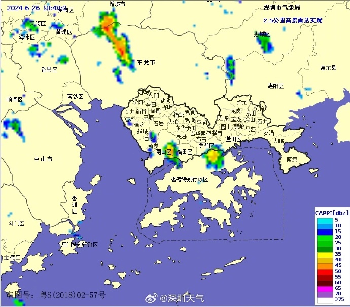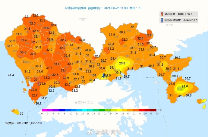 深圳市氣象台2024年6月26日11時發布短臨預報,目前全市大部氣溫在31-33℃,有1個站記錄到35℃以上的最高氣溫。預計今天中午到下午,深圳多雲,局地有短時(雷)陣雨,最高氣溫33℃左右,中北部和人口密集區最高氣溫35℃或以上,體感炎熱。目前全市(含深汕)高溫黃色預警信號生效中,請注意防暑降溫。