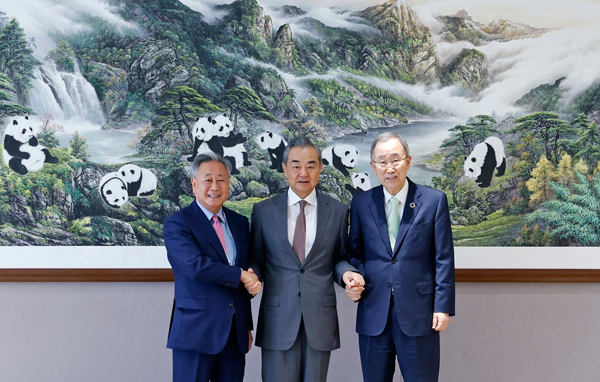 王毅表示,潘基文先生為和平奔走、為發展盡力,積極支持全球發展倡議,大聲疾呼國際社會加緊行動,不讓聯合國2030年可持續發展議程落空,中方對此表示讚賞。正是着眼全人類共同福祉,習近平主席提出構建人類命運共同體、「一帶一路」倡議和三大全球倡議,得到國際社會廣泛贊同和支持。中方願同聯合國一道,匯聚國際合力,為加快落實可持續發展議程注入強勁動力,為世界和平和人類發展作出更大貢獻。