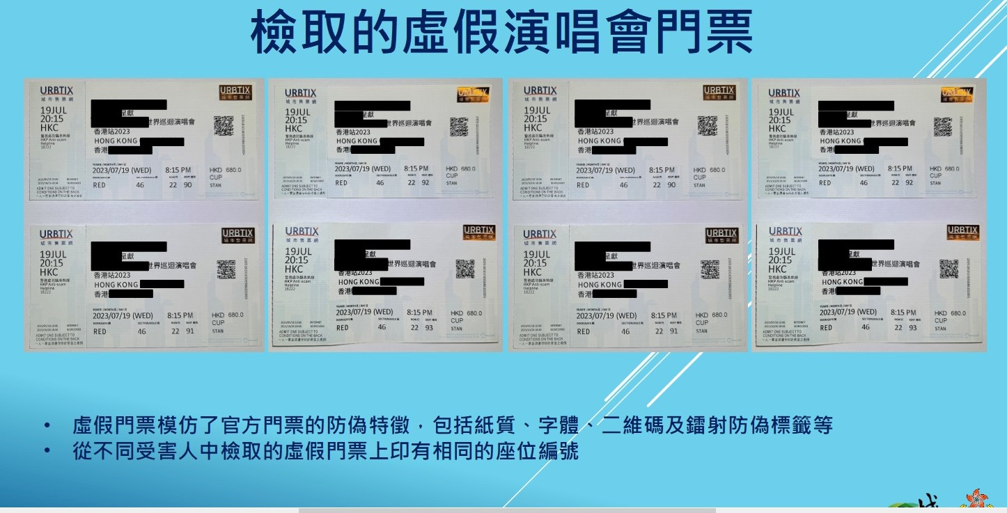 警方接報後展開調查,發現該批門票模仿官方門票的防偽特徵,包括紙質、字體、二維碼和雷射防偽標籤,並在不同的虛假門票中,發現印有相同座位編號。