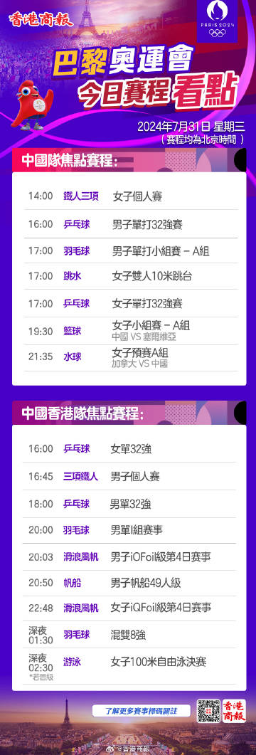 北京時間7月31日,巴黎奧運會進行第5個比賽日,今日將會產生18枚金牌,中國隊在這個比賽日有多個衝金點:跳水——全紅嬋迎巴黎首秀,女雙10米台力爭金牌;羽毛球——小組賽迎來收官,混雙淘汰賽國羽內戰;籃球——中國女籃迎關鍵之戰。另外,中國香港隊將繼續有多個項目出賽:游泳——何詩蓓100米自由泳決賽,再次衝擊獎牌;羽毛球——鄧俊文和謝影雪出戰混雙八強;李卓耀出戰男單,爭小組首名出線;乒乓球——黃鎮廷和朱成竹將分別出戰男女單32強,力爭晉級。