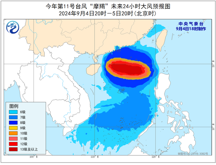 大風預報:9月4日20時至5日20時,台灣海峽、南海大部、巴士海峽、福建中南部沿海、廣東中東部沿海將有6-8級大風,其中南海北部和中部部分海域及東沙群島附近海域將有9-11級大風,「摩羯」中心經過的附近海域的風力可達12-16級、陣風17級以上。