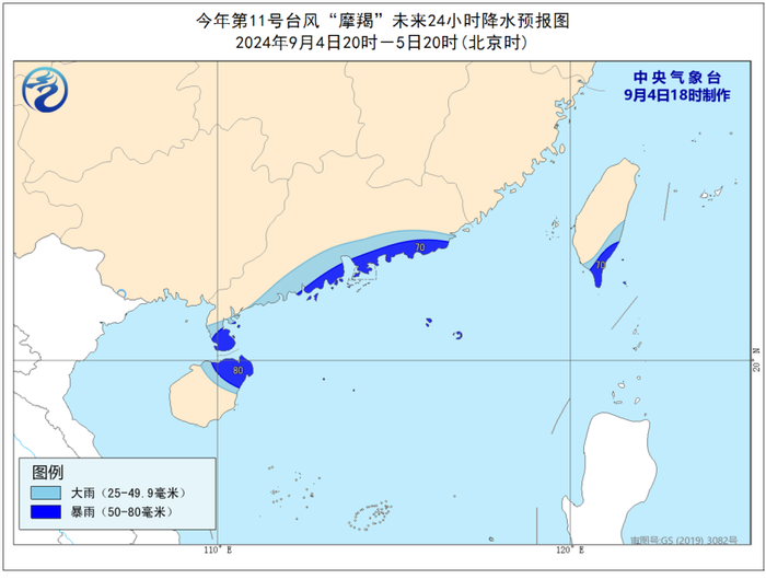 9月4日20時至5日20時,台灣島東南部、廣東南部沿海、海南島東北部等地將有大到暴雨(50-80毫米)。