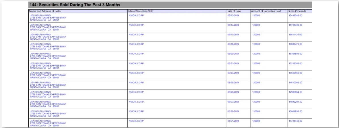 美國證券交易委員會(SEC)最新發布的文件顯示,當地時間9月4日至5日期間,英偉達CEO黃仁勛共售出24萬股英偉達普通股,總價值約2580萬美元。在不到三個月的時間裏,黃仁勛共計出售了近530萬股公司普通股,價值約6.331億美元(約合44.9億元人民幣)。
