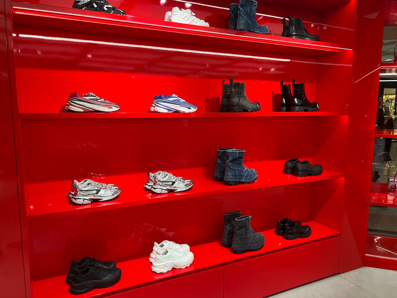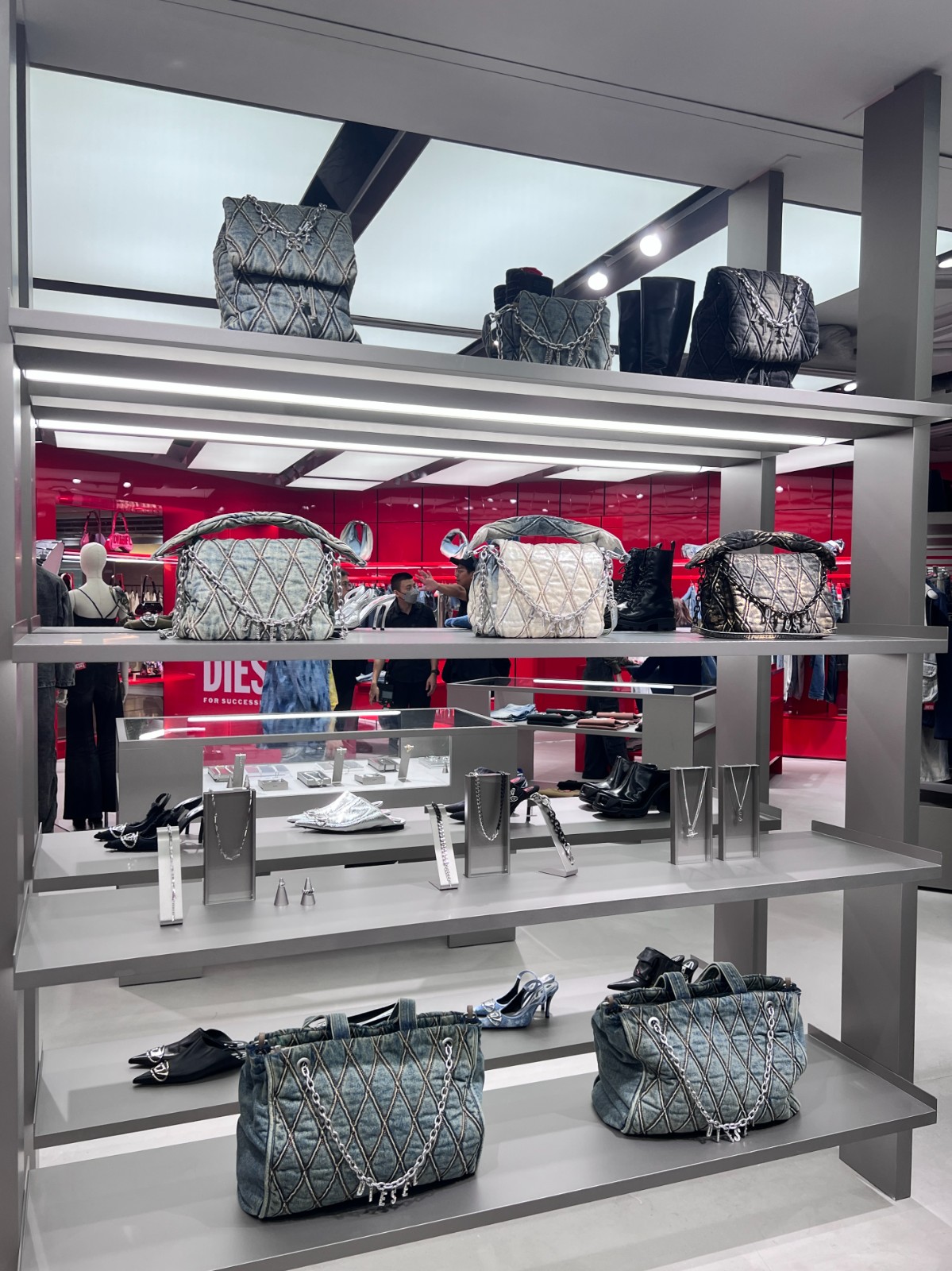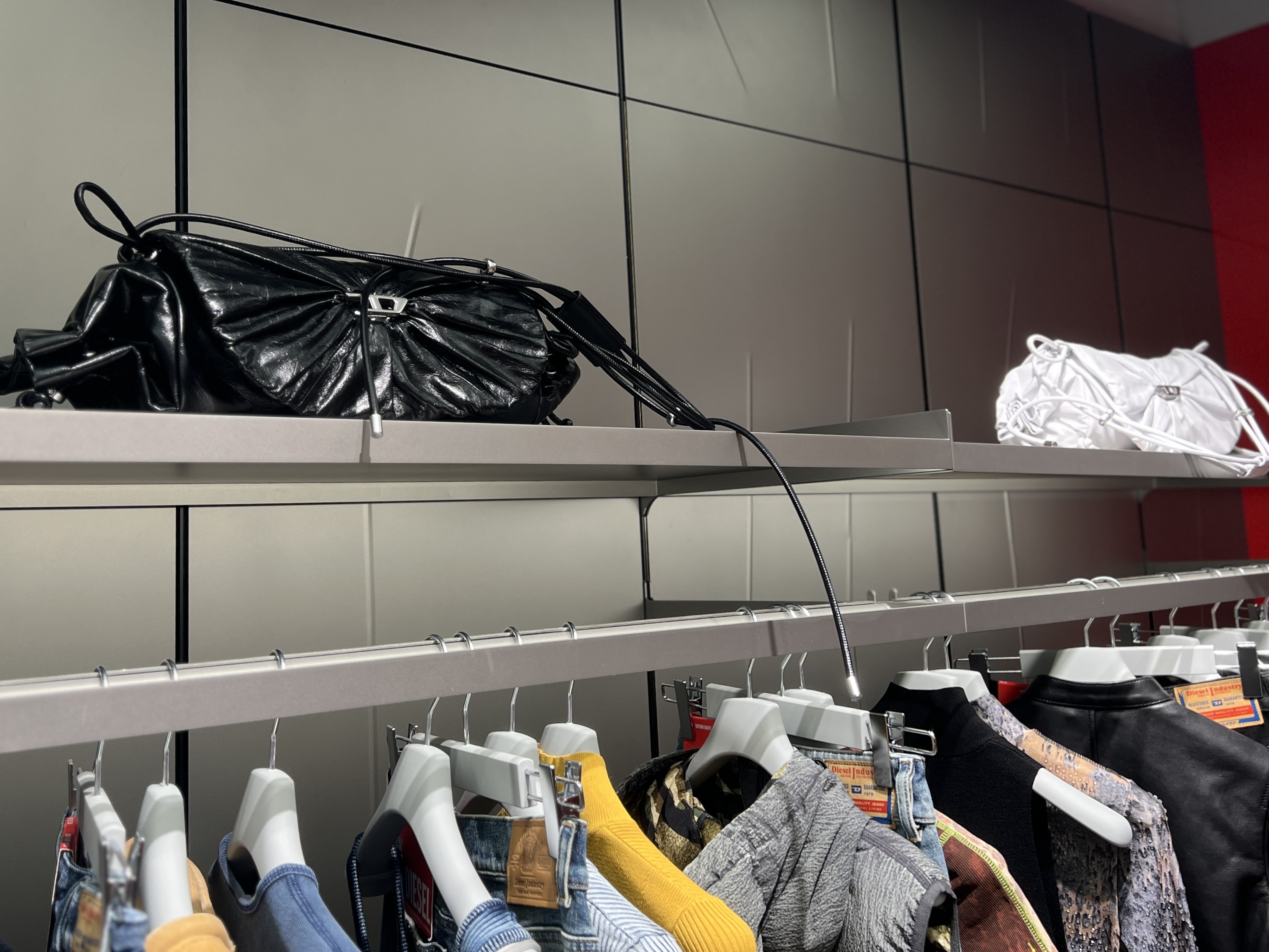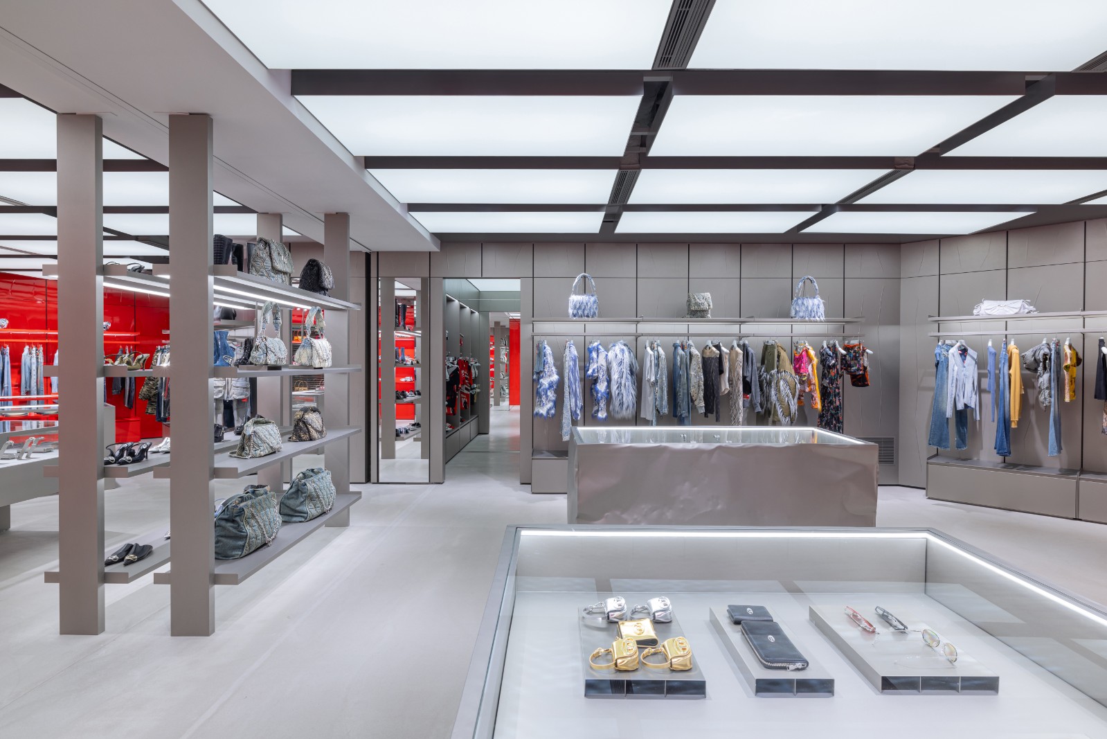 新店齊備品牌多個系列,包括標誌性的牛仔褲系列、男裝、女裝、鞋履、配飾及各款手袋,包括經典1-DR手袋及絎縫牛仔Charm-D手袋。Charm D手袋以經過細緻處理的牛仔布絎縫製成,凹凸有致的菱格紋手袋袋面飾以閃爍水鑽拼成的品牌字母吊飾,相當型格。在2024秋冬時裝展首次亮相的Scrunch-D手袋亦登陸新店,袋上柔軟的皮革圍着鑲於正中間的「D」logo,袋身兩邊則配以拉繩側袋,造型充滿前衛感。