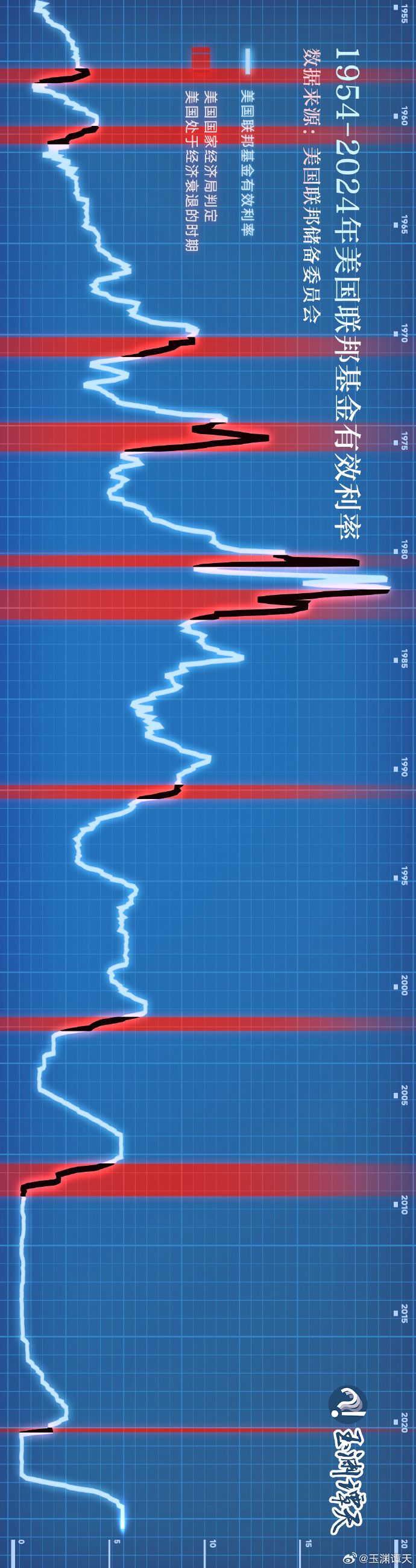 這張美國有效聯邦基金利率(Effective Federal Funds Rate)的圖中,紅色陰影區域是美國國家經濟研究局(National Bureau of Economic Research)判定美國處於經濟衰退的時期。