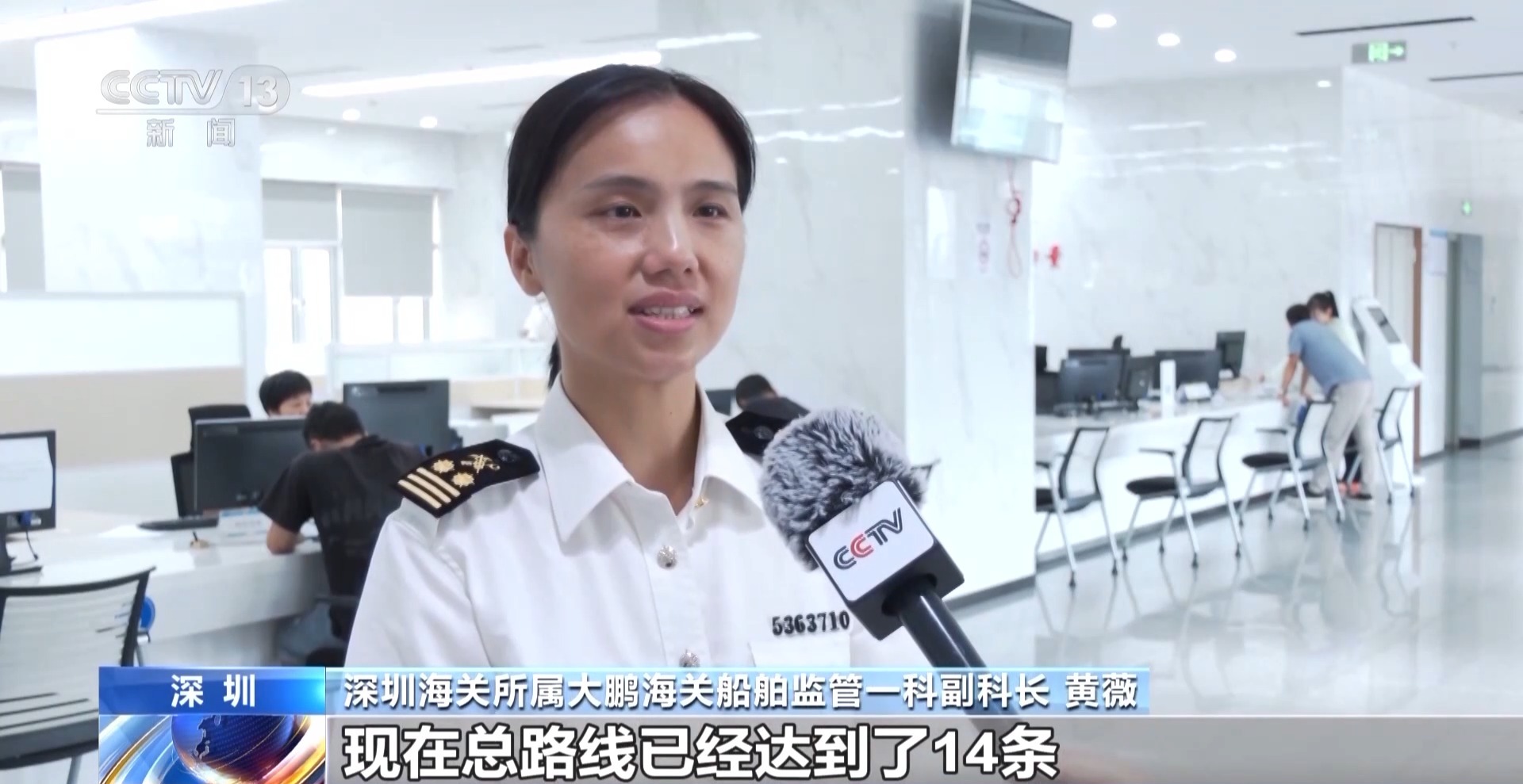 深圳海關所屬大鵬海關船舶監管一科副科長 黃薇:今年鹽田港「大灣區組合港」路線在旺盛需求下快速增長,總路線現在已經達到了14條。今年前三季度,鹽田港以大灣區組合港模式通關的貨物達1.2萬櫃,是去年同期的4.3倍。