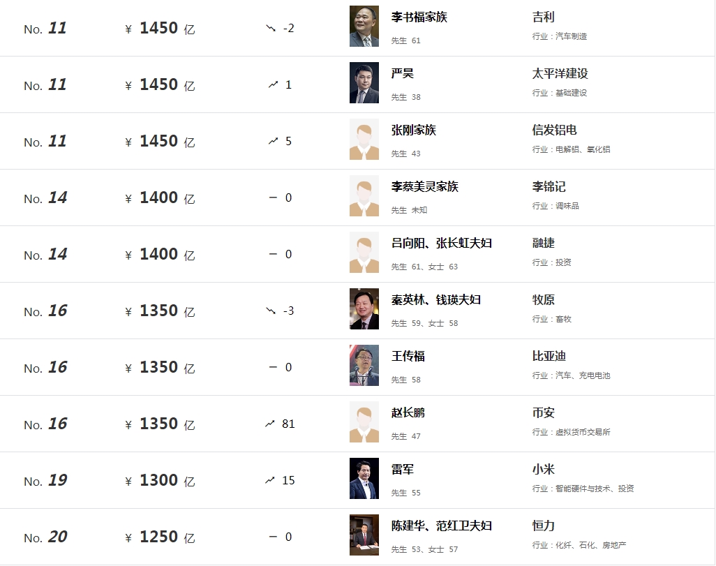 此外,上榜的港澳台企業家共153位,比去年多11位,佔比上升3%至14%。其中台灣97位,比去年多15位;香港56位,比去年少4位。李嘉誠、李澤鉅父子和李兆基家族進入榜單前十,財富分別是2000億元和1750億元。