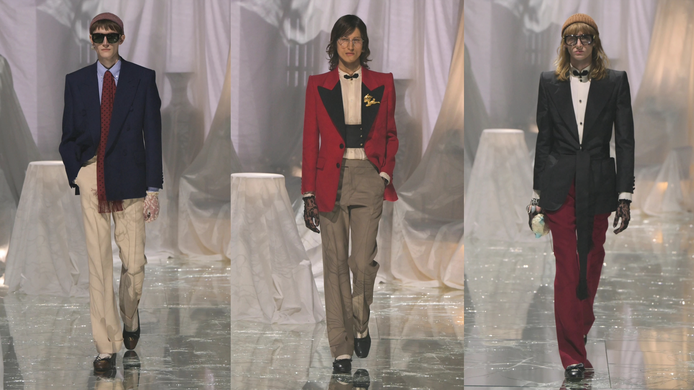 系列男裝以復古西裝、燕尾服、盤扣領結等元素與女裝的華麗風格相呼應,模特佩戴蕾絲手套、搭配刺繡裝飾,營造出一種跨越性別的復古氛圍。Michele通過這些設計,巧妙地將六十至八十年代的復古風格融入現代時尚,同時保留了品牌獨有的辨識度。