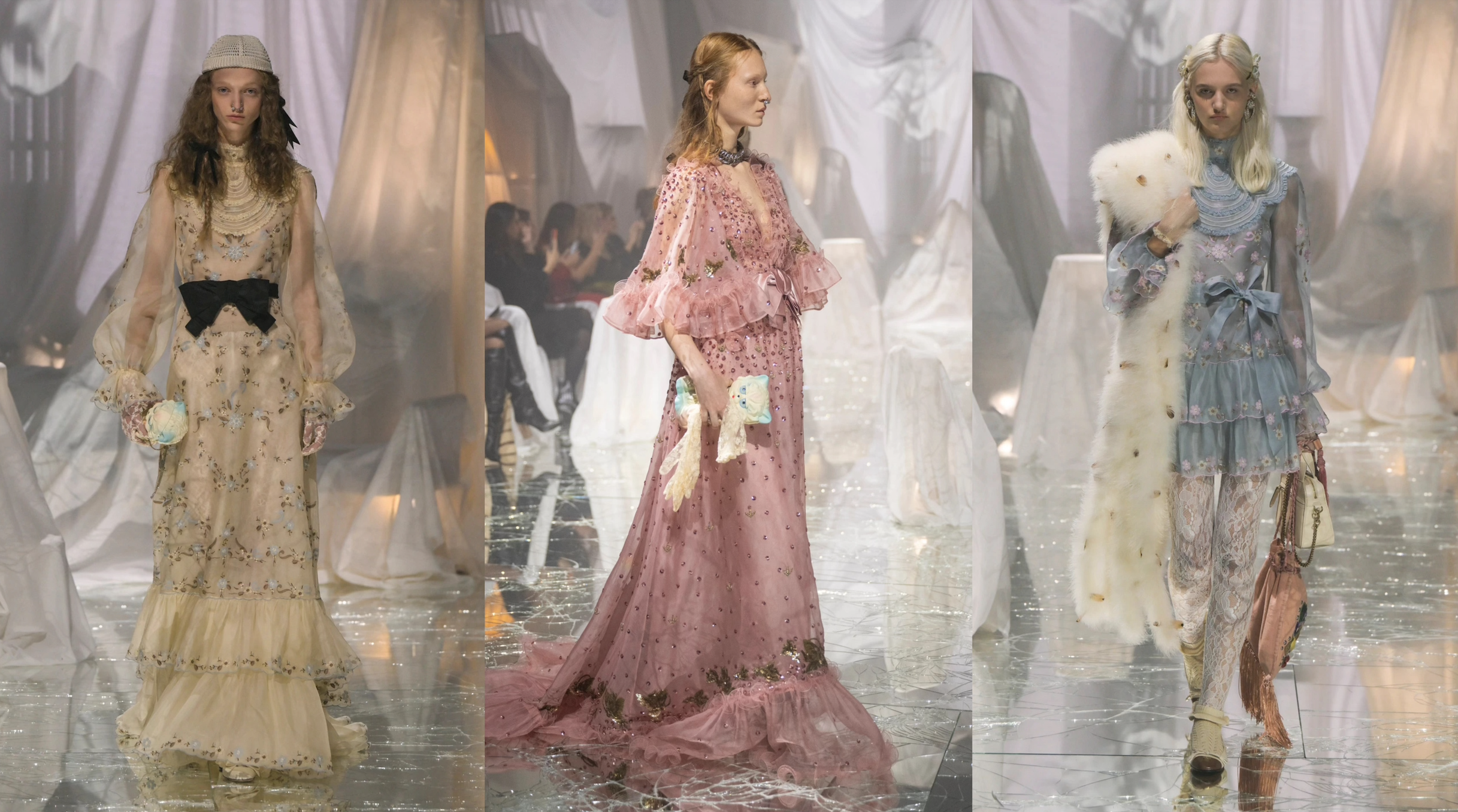 配飾同樣是該系列的一大亮點。絲綢頭巾、網狀面紗、深帽簷禮帽以及點綴蝴蝶結的蕾絲手套等元素,為整體造型增添復古韻味。而鼻環、眼鏡、珠寶等裝飾則為復古風格注入了現代感,將復古的嬉皮時尚與女性優雅結合,形成視覺上的強烈對比,抓人眼球。細節設計不僅豐富了整體造型,也令穿着者可在復古與現代之間自由轉換。(部分圖片、記者:Katherine)