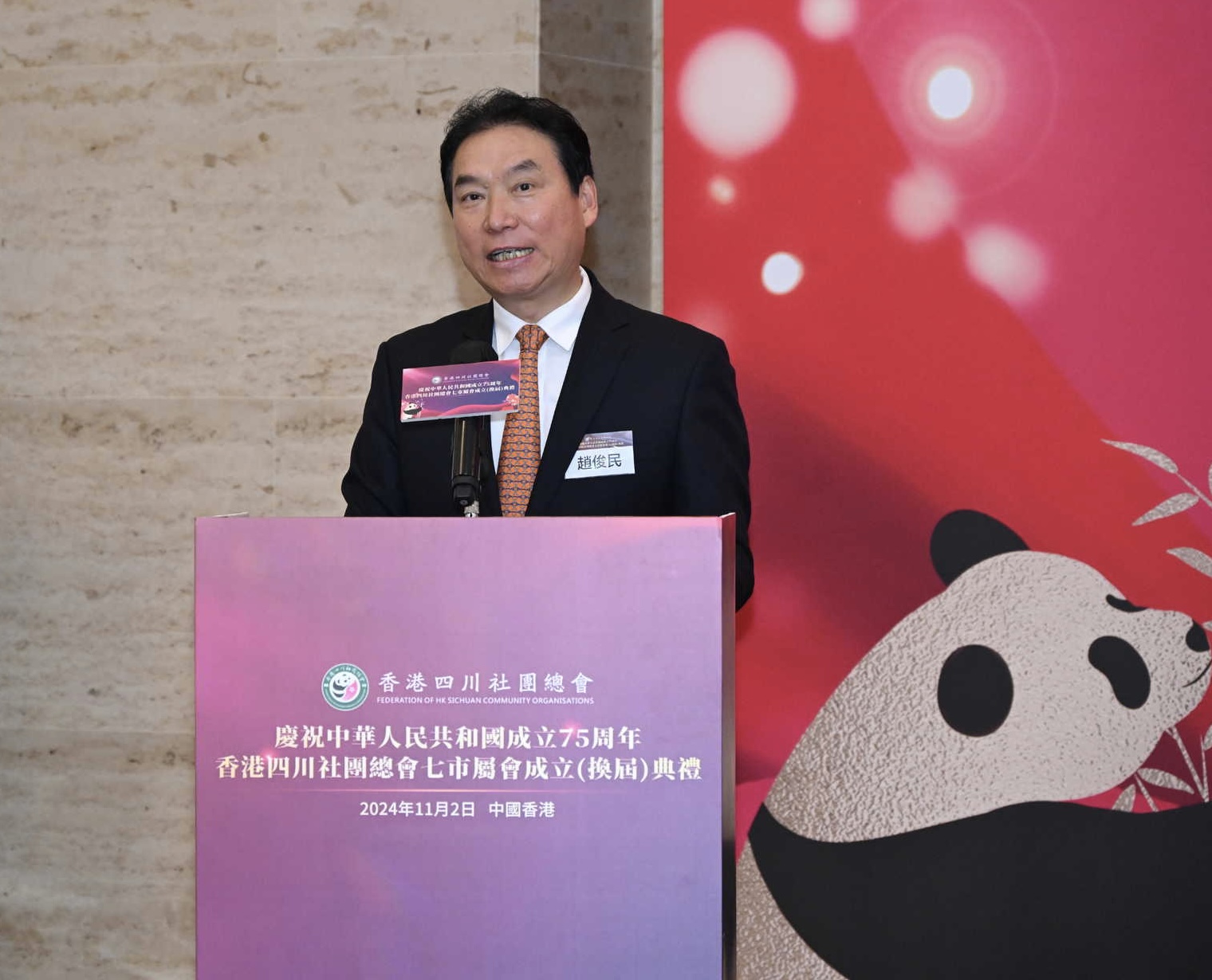 趙俊民在致辭中指出,長期以來,一批批四川鄉親來到香港,艱苦奮鬥,成就事業,書寫了篳路藍縷、燦爛輝煌的創業史,也讓四川人文精神在香港得到發揚和彰顯。希望香港四川社團總會及各屬會,堅定不移支持行政長官和特區政府依法施政,積極參與香港社會事務;用好既熟悉香港、又熟悉四川的獨特優勢,吸引帶動香港經濟界人士到川創業發展;參與和支持社團的各項工作、各類活動,共同搞好同鄉社團自身建設。